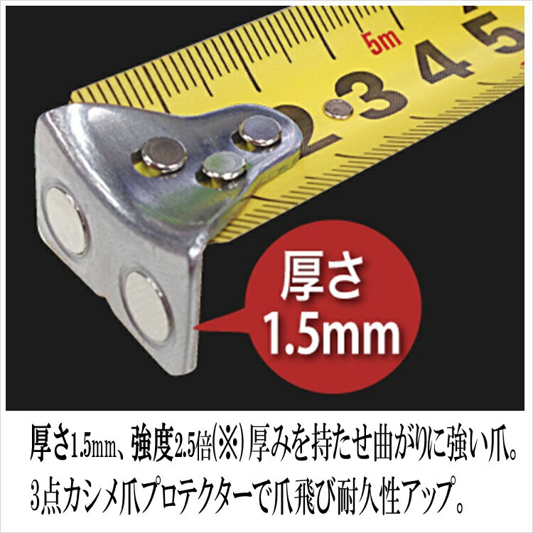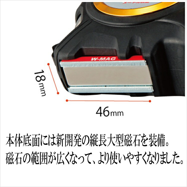 タジマ コンベックス・スケール 剛厚セフGロックダブルマグ25 6.5m メートル目盛 25mm×6.5m(GASFGLWM2565) 剛性力1.5倍の剛厚ダブルマグコンベックス 【特徴】 ・通常テープより測定距離が伸びる剛性力1.5倍のストロングテープ採用 ・一人でピッチ出しができる本体と爪のダブルマグ仕様 ・吸着力が高く握りやすい新設計の縦長磁石 ・片手で簡単脱着できる、落下防止用ベルトホルダー付 ・落下時の衝撃から爪を守るフックガードバンパー ・ショックアブソーバー付 ・落下時の衝撃からコンベを守るダブルマグ専用アーマードケース ・鉄にガッチリ付く、マグ爪採用 ・爪飛び防止用プロテクター付 ・0点補正移動爪 【商品仕様】 目盛仕様:メートル目盛、JIS1級、両面目盛 テープ幅:25mm テープ長さ:6.5m テープ:イエローテープ 取り付け可能ベルトサイズ:幅60mm以内/厚み5.5mm以内 本体マグ力:25kg 磁束密度340mT 剛厚爪マグ力:ネオジ磁石 磁束密度260mT 【材質】 テープ:SK85(旧SK5) バネ:SK85(旧SK5) ケース:ABS樹脂 カバー:エラストマー樹脂 その他コンベ・スケールはこちら ※ご使用前に注意書きをよく読んでご使用ください。 ※PC環境によって色の差異がありますのでご了承下さい。