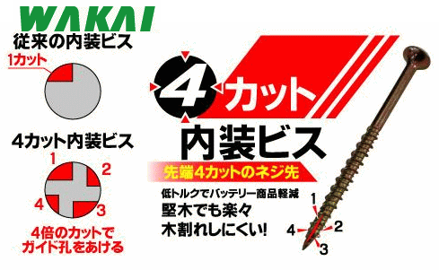 特徴 先端4カットのネジ先 ■ ビス打ちが超ラク ■ 堅木でも楽々、木割れ防止機能UP ■ 低トルクで充電工具のバッテリー消費を軽減 鋭いビス先がミリのない打込みを、高いネジ山と低いネジ山を組み合わせた、 ハイ&ロー構造で抜群の保持力を生み出します。衝撃による釘浮きや、相手木材の伸縮による板浮きを防止します。 長押・床板・広小舞・化粧垂木の締付け等、幅広い用途でご利用いただけます。 ■4.2x65mm 半ネジタイプ [建築金物][木ネジ][JAN: ]