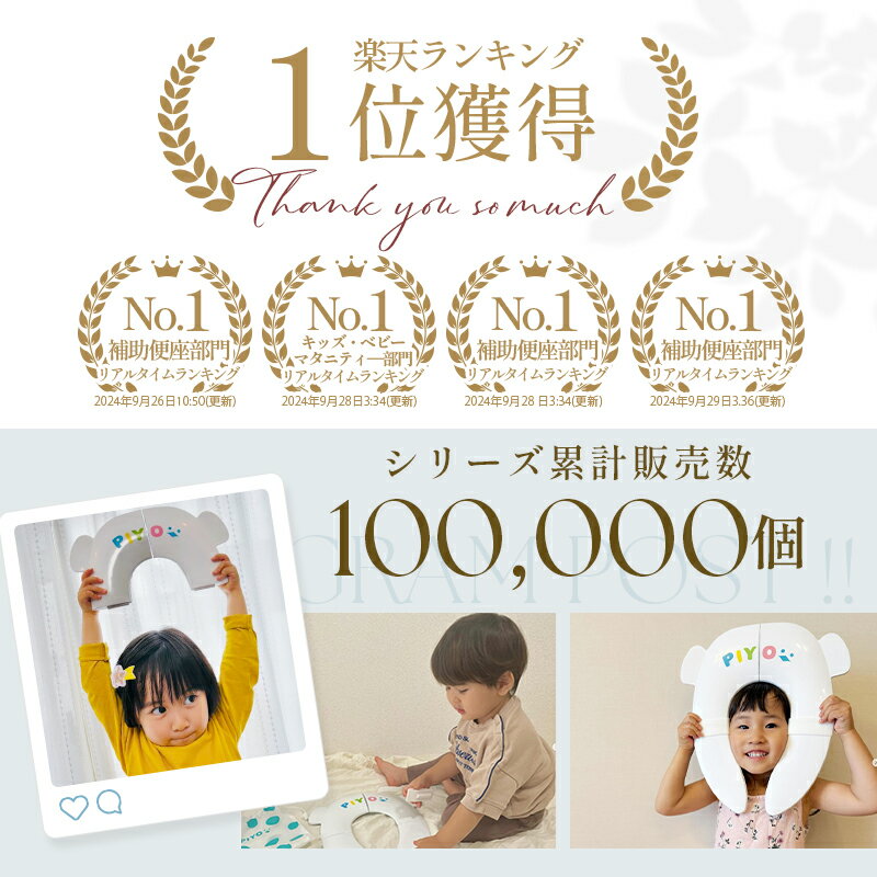 PIYOからトイレトレーニングに人気のアイテム補助便座(トイレトレーナー)と踏み台(ステップ台)がセットになって登場 ●PIYO 折りたたみ式トイレトレーナー 【商品説明】 日本の子ども用品・ベビーグッズブランドPIYOから高品質な補助便座が登場! トイレトレーナーなどで知られる取っ手付きの赤ちゃん用補助便座は、お子様が安全でかつ快適に自立してトイレができるようになるのをサポートします。 設置も簡単で、トイレの便座に置いて調整するだけ。 「補助便座が欲しいけど、かさばって収納場所に困る・・・」「外出時にも使える補助便座が欲しい!」という声にお応え! 日本の子ども用品ブランドPIYOから折りたたみ式の補助便座が新登場。 展開時サイズ:36 x 26 x 2.5cm 内側サイズ:幅11cm 長さ24.5cm 折り畳みサイズ:18 × 12.5 × 5.5cm 重量:250g 素材:BPAフリーABS セット内容:補助便座、収納ポーチ 【注意事項】現在滑り止めの部分を改良し、吸盤を設置しております。またモニターの明るさなどにより画像内の製品と実物の色味が異なって見える場合がございます。予めご了承下さい。 メーカー希望小売価格はメーカーサイトに基づいて掲載しています