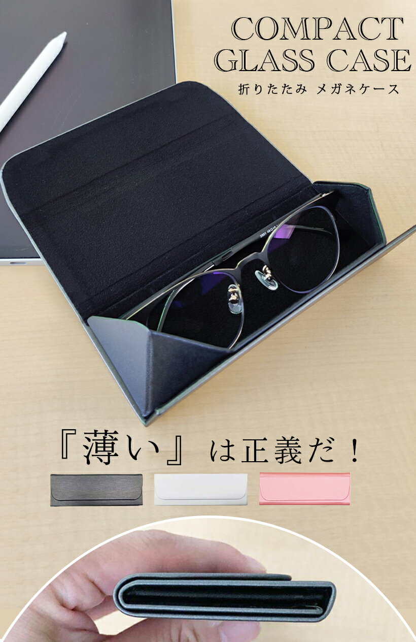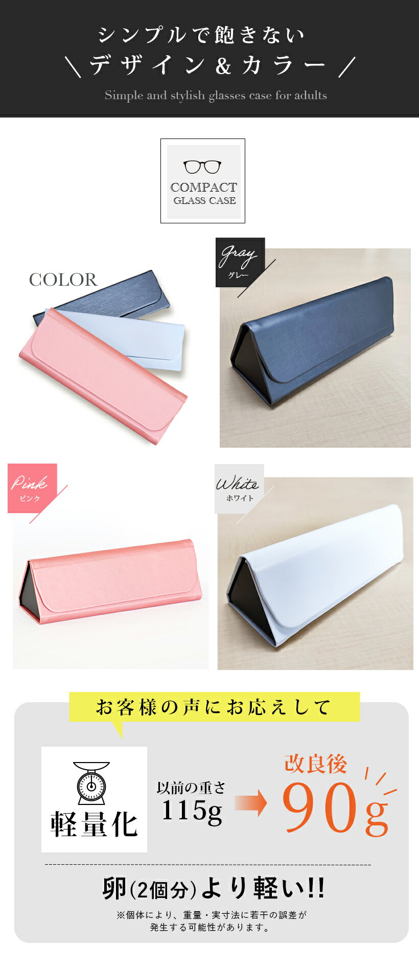 COMPACT GLASS CASE ~折りたたみメガネケース~ 「薄い」は正義だ! シンプルで飽きないデザイン&カラーを追求したメガネケースです。 お客様の声にお答えして軽量化! 以前は115gでしたが、改良後は90gに! ※個体により、重量・実寸法に若干の誤差が発生する可能性があります。 持ち運びに便利な薄型コンパクトなメガネケース 【POINT1】折りたたみ可能 【POINT2】スエード調 クッション性のある内側 【POINT3】シンプルデザイン メガネを収納しない時、折りたたみ可能 メガネケースのお悩み メガネケースにこんな『お悩み』ありませんか? 「メガネケースでカバンが膨らむ…」 「メガネケースを使わない時、かさばる…」 そんなお悩みを解決できる『折りたたみメガネケース』登場! 【POINT1】メガネを収納しない時、折りたたみ可能 折りたためるメガネケース誕生! 折りたためば薄さたったの12mm! ※個体により、重量・実寸法に若干の誤差が発生する可能性があります。 メガネケースを使わない時、かさばっていませんか? 使わない時に折りたたんで、かさばらずに持ち運び可能! スリムでワイシャツのポケットにも収まる薄型タイプ! 軽量になってポケットにも収納しやすい◎ メガネを収納してカバンの中に入れても、かさばらない! 【POINT2】高級感のある落ち着いたデザイン カジュアルにもフォーマルにも、シンプルで飽きのこないデザイン メガネケースに見えないスリム構造 ビジネスにもお出かけにも大活躍 【POINT3】メガネを包み込む、大事な内部生地 内部生地にもこだわり、大切なメガネを包み込みます。 クッション性のある内側素材の内張り スエード調の生地使用 ※グレー・ピンクの内張りは黒、ホワイトの内張りはグレーです。 【POINT4】持ち運びに便利 メガネを収納しない時はメガネケースを折りたたんで、小さいカバンにも入る レビュー平均4.36!(当ショップ 商品レビュー平均 2024年1月13日時点) たくさんの嬉しいお声ありがとうございます! ■素材の特性上の注意 素材の特性上、フタと接する部分が凹みのようになっている場合がございますのでご了承ください。 ■メガネケース使用上の注意 ・メガネケースを直射日光の当たる場所(車中)や高温になる場所に置かないで下さい。 (高温によりメガネやケースが軟化変形する恐れがあります。) ・ふたの開閉は丁寧におこなって下さい。 無理な状態での開け閉めは、ケースが破損したりメガネが落下する恐れがあります。 ・ケースに強い衝撃を与えないで下さい。 ケースやケースの中のメガネが破損、変形する恐れがあります。 ・接着剤を使用し形成しています。 臭いが気になる場合は風通しの良い日陰に置き、臭いが消えてからご使用ください。 ・各種の資材は経年変化や摩耗などで、変色・変形・ゆるみ・色落ちが発生する場合があります。 ・マグネット(磁石)を使用したケースに、磁気カードを近付けないでください。磁気が破損する恐れがあります。 仕様 タイプ マグネット式、折りたたみ式 素材 アルミPU張 カラー グレー、ピンク、ホワイト、シルバー 原産国 中国▼クリックで特設会場へ▼ \特設会場でクーポン配布中/ ▼▼もっとスリムさをお求めの方はこちら▼▼ ▼▼大きめサングラスも入るケースをお求めの方はこちら▼▼