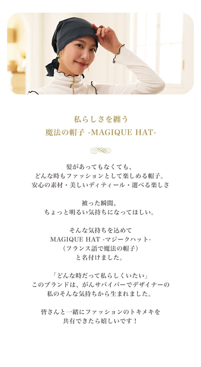 商品名 Magique Hat -Karina-(マジークハット -カリーナ-)バンダナタイプ 無地 サイズ フリーサイズ(約54〜61cm) カラー グレージュ・ネイビー・ブラック・マスタード 素材綿100% 商品について◎トップに大きくギャザーを寄せ、ペタっとせず、頭の形が綺麗に見える! ◎後ろ部分のゴムギャザーで締め付けずにピッタリフィット ※伸縮性があるので、ウイッグ使用時でもそのままでもOK! ◎襟足のフリルが大き目で、生え際もお洒落にフォロー ◎裏生地は縫い目が肌にあたらない仕様。最高級の綿100%の生地を使用 ◎かぶり方は超簡単!すぽっと被って結わくだけ ◎伸縮性があり、ウイッグ使用時でも、脱毛時でも ご注意 ※画面上と実物では多少、色具合が異なって見える場合もございます。 ※サイズについては実商品と細かい誤差がある場合もございます。※当店では「お買い上げ明細書(納品書)」を発行しておりません。必要なお客様は備考欄に「納品書希望」とご記入ください。商品名 Magique Hat -Karina-(マジークハット -カリーナ-)バンダナタイプ 無地 サイズ フリーサイズ(約54〜61cm) カラー グレージュ・ネイビー・ブラック・マスタード 素材綿100% 商品について◎トップに大きくギャザーを寄せ、ペタっとせず、頭の形が綺麗に見える! ◎後ろ部分のゴムギャザーで締め付けずにピッタリフィット ※伸縮性があるので、ウイッグ使用時でもそのままでもOK! ◎襟足のフリルが大き目で、生え際もお洒落にフォロー ◎裏生地は縫い目が肌にあたらない仕様。最高級の綿100%の生地を使用 ◎かぶり方は超簡単!すぽっと被って結わくだけ ◎伸縮性があり、ウイッグ使用時でも、脱毛時でも ご注意※画面上と実物では多少、色具合が異なって見える場合もございます。 ※サイズについては実商品と細かい誤差がある場合もございます。※当店では「お買い上げ明細書(納品書)」を発行しておりません。必要なお客様は備考欄に「納品書希望」とご記入ください。 ▽ おすすめ商品 ▽