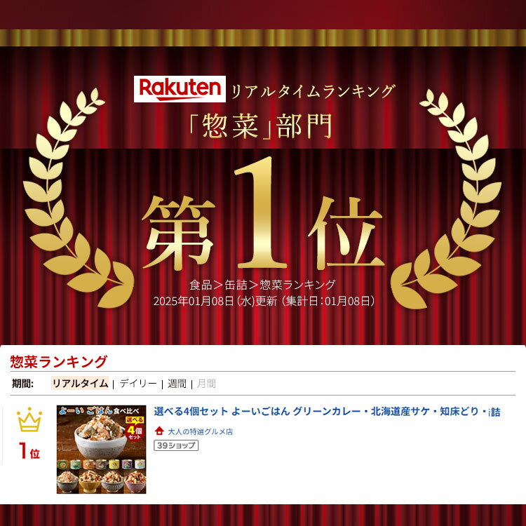 商品名 よーいごはん 選べる4個セット 内容量(約) 200g/1個(グリーンカレーは190g) セット内容 4缶セット 原材料名 【グリーンカレー】鶏肉(北海道産)、牛乳、グリーンカレーペースト(グリーンチリ、レモングラス、ニンニク、食塩、ガランガル、エビペースト、カフィルライムピール、コリアンダーシード、ペッパー、クミン、ターメリック)、砂糖、魚醤、醤油、塩、(一部に大豆・乳成分・エビ・小麦・鶏肉を含む)【北海道産サケ&羅臼こんぶ】鮭(北海道産)、油揚げ(丸大豆、植物油)、人参、生姜、胡麻、昆布スープ(昆布ペースト(北海道製造)、食塩、蜂蜜、鰹節エキス、ホタテエキス)/調味料(アミノ酸等)、(一部に小麦・大豆・鶏肉・さけ・ごまを含む)【知床どり&羅臼こんぶ】鶏肉(北海道産)、ふき、人参、椎茸、胡麻、昆布スープ(昆布ペースト(北海道製造)、食塩、蜂蜜、鰹節エキス、ホタテエキス)/調味料(アミノ酸等)、(一部に大豆・小麦・鶏肉・ごまを含む)【十勝野ポーク】豚肉(北海道産)、油揚げ(丸大豆、植物油)、生姜、醤油、味醂、鰹けずり節、昆布、(一部に大豆・小麦・豚肉を含む)【豚丼風】豚肉(北海道産)、玉葱、須臾、味醂、砂糖、鰹けずり節、昆布、(一部に大豆・小麦・豚肉を含む)【十勝産コーン】カーネルコーン(とうもろこし(北海道産))、ホタテ(北海道産)、醤油、味醂、砂糖、バター(生乳、食塩)、鰹けずり節、昆布、(一部に大豆・小麦・乳成分を含む) 【ごぼう&小エビ】 ごぼう、油揚げ(丸大豆、植物油)、人参、しめじ、舞茸、醤油、味醂、小エビ、砂糖、鰹削り節、昆布、(一部に大豆・小麦・えびを含む) 【エゾ鹿&ふき】鹿肉(北海道産)、ふき、牛蒡、人参、醤油、砂糖、味醂、鰹けずり節、昆布、(原材料の一部に、大豆、小麦を含む) 【ごぼうと黒毛和牛】牛肉(国産)、牛蒡、しめじ、人参、醤油、味醂、砂糖、(一部に大豆・小麦を含む) 【ジンギスカン】羊肉(オーストラリア)、玉葱、たれ(醤油、てん菜糖蜜、砂糖、食塩、タンパク加水分解物、醸造酢、玉葱ペースト、果糖ぶどう糖液糖、発酵調味料、香辛料、にんにくペースト、蜂蜜、生姜エキス、みりん、オニオンエキス、オニオンパウダー、酵母エキス、生姜ペースト)/調味料(アミノ酸等)、酸味料、カラメル色素、香辛料抽出分、(一部に大豆・小麦を含む) 原産国 日本 栄養成分表示 【グリーンカレー】エネルギー119kcal、たんぱく質5.8g、脂質8.8g、炭水化物4.2g、食塩相当量1.43g【北海道産サケ】エネルギー114kcal、たんぱく質10.3g、脂質5.0g、炭水化物6.9g、食塩相当量2.13g【知床どり】エネルギー96kcal、たんぱく質6.3g、脂質4.7g、炭水化物7.2g、食塩相当量2.0g【十勝野ポーク】エネルギー129kcal、たんぱく質11.3g、脂質6.5g、炭水化物6.4g、食塩相当量3.5g【豚丼風】エネルギー171kcal、たんぱく質9.0g、脂質9.0g、炭水化物13.5g、食塩相当量1.74g【十勝産コーン】エネルギー96kcal、たんぱく質7.7g、脂質1.3g、炭水化物13.3g、食塩相当量1.80g 【ごぼう&小エビ】エネルギー131kcal、たんぱく質5.1g、脂質4.4g、炭水化物17.8g、食塩相当量2.36g 【エゾ鹿&ふき】エネルギー84kcal、たんぱく質3.9g、脂質1.5g、炭水化物13.6g、食塩相当量2.5g 【ごぼうと黒毛和牛】エネルギー173kcal、たんぱく質8.0g、脂質10.4g、炭水化物11.9g、食塩相当量1.91g 【ジンギスカン】エネルギー202kcal、たんぱく質9.9g、脂質14.0g、炭水化物9.1g、食塩相当量2.27g ※100gあたり 仕様 保存方法:常温で保存配送方法:常温便にて発送 賞味期限 製造日より3年 注意事項 ※セットごとの個別包装をご希望のお客様は備考欄にご記入ください。 上記記載がない場合には注文ごとにまとめて梱包させていただきます。 ※商品の色はモニターの具合で実物と若干異なる場合がございます。予めご了承下さい。※デザイン、仕様等につきましては、予告なく変更する場合がございます。予めご了承下さい。※ご予約・お取り寄せ商品は、ご注文受付後にお客様ご注文分としてメーカーへ発注を致します為、基本的にキャンセルやご返品はお受けできません。※複数店舗を運営しておりますため、ご注文の入れ違い等で欠品などになってしまう場合がございます。万が一、発送が遅れる場合は、ご注文受付当日中にご案内差し上げます。誠に恐れ入りますがご了承くださいますよう、お願い申し上げます。よーいごはん 選べる4個セット ●新味追加しました! 単品販売コンプリート!全10種セット あったかごはんにまぜるだけで本格まぜごはんが完成。 北海道の陸別町の「浜田旅館」。宿泊客に大好評の“まぜごはん”を缶詰にしました! 道東の食材にこだわった「よーいごはん」は、炊いたごはんにまぜるだけ。 北海道の味をご自宅で、手軽に味わえます。 ホカホカの混ぜご飯はもちろん、アイデア次第でいろんな料理にも使える万能な缶詰です。 10種類からお好きな4個を選べます! ●陸別牛乳&知床どり グリーンカレー 陸別牛乳&知床どりを使用したグリーンカレー。旨味が凝縮されたまろやか&スパイシーなスープカレーです。●北