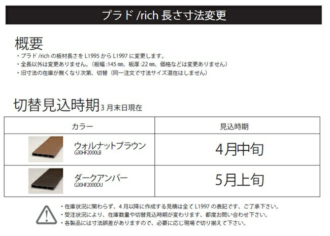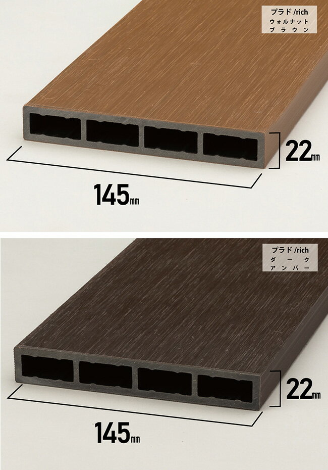 製造元のグローベン株式会社より「プラド/rich 長さ寸法変更」のお知らせがありました。当店サイトも1997mmに変更しております。 【樹脂製目隠しフェンス】 商品名:プラド/rich フェンス板材(プラドリッチ) サイズ:W145×L1997×t22mm 重量: 3.62kg/1枚 品番:G30HF2000LB(ウォルナットブラウン)、G30HF2000DU(ダークアンバー) (L値±5mm程度の誤差が生じる場合があります) ※本商品は板材1枚単品部材 横張りタイプ 強度を増したプラド/rich には、樹脂フェンス材に求められるジョイント材が不要です。プラド/one が持つ木質感はそのままに、すっきりとした見栄えとなり、天然木フェンスのような景観にできます。 表層は高密度ポリエチレン樹脂で、表層をコーティングすることで耐候性が向上。さらに成型後のサンディング加工により、木目のような筋模様を再現しています。芯材には高密度ポリエチレン樹脂に木粉を混合し、樹脂素材の欠点である「気温による伸縮や経年変化」を緩和します。加工がしやすく、作業がスムーズ。硬過ぎず、柔らか 過ぎない複層合成木材:プラドだから、切断や組立など加工・ビス打ちもしやすい等の作業性にも優れています。 ※ご参考※ プラド/rich板材とプラド用アルミ支柱のカラー組み合わせ