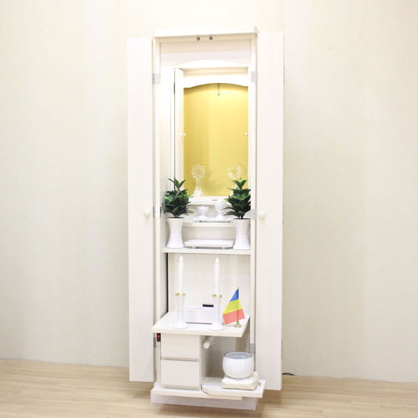 送料無料・安心の5年保証付き ※こちらの商品は、お仏壇本体のみの価格となります。仏具セットが必要な方は【仏具の選択】からお選びください。 【商品仕様】 表面材 ホワイト 木目調プリント(合成杢) 芯材 MDF(木質繊維材) 原産国 日本 本体サイズ 高さ147.0cm 幅40.5cm 奥行38.0cm※置台(5.0cm)の高さも含んでおります。※外扉折りたたみ時の幅60.5cm 厨子サイズ 高さ54.0cm 幅33.0cm※特装御本尊様がご安置できます。 厨子扉 手動式 内折れ開閉式 外扉 4枚戸 前開き 設備 LED照明収納経机&リン台収納スペース(2か所)同色系置台(5cm)耐震キッド 備考 画像と実物は若干色が異なる場合があります。 【商品説明】 木目調シートを使用した事で大変にお求めやすいプライスが実現しました。 本体高さ142cmと若干低めですので、当店では置台(5cm)をおつけして総高さ147cmで販売をしています。 上部にはエコで長寿命のLED照明を設置して明るく照らします。 経机には小物入れが2杯ご用意しています。(高さ7.5cm幅9.0cm奥行19.5cm) リン台は回転式となっていますのでお好みの位置でお使いいただけます。 外扉の角度を調整いただければ、幅52cm以上あれば設置可能です。 【仏具のオプション内容】 〇PC製:ヴィクトリー仏具9点セット・パールホワイト色/徳利:エイトリーフ・クリア +共通仏具一式:手打ちりん3,0寸(アイボリー塗装)/フトン3,0号/棒(白)6号/電子ローソク/造花しきみ/お手入れ用品/線香/他