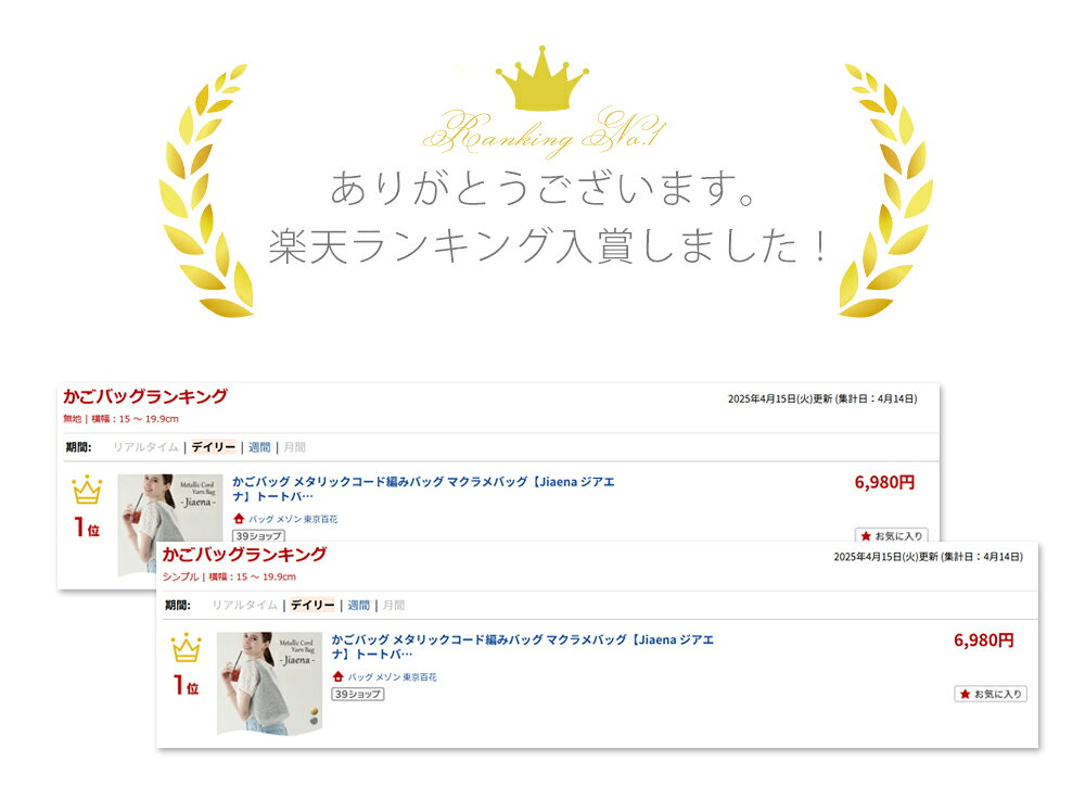 [東京百花 楽天市場店]ではおすすめ人気商品を多数取り揃えております。 製造工程の関係上、各採寸箇所実寸より【約-3cm〜+3cm】程度は誤差の許容範囲とさせて頂いております。予めご了承ください。入荷時期や生産ロットにより素材の一部が変更になる場合がございます。 2025年 バレンタイン・ホワイトデー・母の日・父の日・お誕生日・バースデー・ハロウィン・クリスマスなど贈り物・ギフトラッピング承ります。 ※モニターの発色の具合によって実際のものと色が異なる場合ががございます。予めご了承ください。 本革・合皮/バッグ・小物・ブランド雑貨/シンプル/丈夫ポケット/レディースバッグ/小さい・大きい 軽い/軽量/容量/ポケット/通勤・通学・セレモニー学校行事・入園・入学・卒業・保護者会・オケージョン結婚式・習い事/インフルエンサー/インスタ/インスタ映え大人/人気/ランキング/こなれ感/高見え/垢抜けおしゃれ/おしゃれ感/大人 可愛い/かわいい/30代 アラサー40代 アラフォー/50代 アラフィフ/春夏秋冬※予約商品は日時指定できません。入荷次第、順次発送いたします。 ワンショルダーメタリックコード編みバッグ【Jiaena ジアエナ】 ワンショルダーと底のレザー調素材で 周りと差がつくメタリックバッグ トレンドのシルバーとゴールドカラーの メタリックバッグ。 シルバーのバッグは当店でも大人気のカラーですが ワンショルダーのメタリック編みで 他には無い華やかな大人っぽさを。 華やかなゴールドカラーは キラキラ感が夏の日差しにマッチして より一層季節感を演出! 左:シルバー/右:ゴールド(model:160cm) ゴールド(model:160cm) シルバー(model:160cm) すっきりとした印象の ワンショルダーのメタリックバッグは 珍しいデザインだから これ一つでこなれた印象になり 周りと差がつきやすい。 底のレザー調の素材は 高級感もあり、 他には無いクールな大人っぽさがPlusされます! ゴールド(model:160cm) シルバー(model:160cm) 一般的なかごバッグのような天然素材ではなく、 キラッと輝くメタリックコードが カジュアルにもキレイめコーデにも。 幅広い夏のコーデやお出かけにマッチして 垢ぬけた大人の夏を演出してくれます。 ゴールド(model:160cm) シルバー(model:160cm) ゴールド(model:160cm) 普段のコーデに変化を加えて 華やかに 思いっきり夏を楽しみたい! そんなポジティブな 大人の夏コーデの相棒に。 コーデの幅が広がる 2色をご用意しました。 縦長フォルムだから ペットボトルや長財布 サングラスや単行本など 普段必要なものを縦にすっぽりと収納できます。 2つの内ポケットには カギやスマホなど小物類の迷子防止に。 ↓↓↓他のシリーズはこちら↓↓↓ 左:ゴールド/右:シルバー(model:160cm) ゴールド(model:160cm) 左:ゴールド/右:シルバー(model:160cm) 商品詳細 素材 本体外側:メタリックコード 本体内側:ポリエステル 底:合成皮革 カラー ゴールド シルバー サイズ 本体高さ:44cm(持ち手含む) 開口部横幅:24.5cm 底部横幅:18cm マチ:18cm 持ち手高さ:24cm ※サイズは計測方法・部分により多少の誤差が出ることがございます。 ※ハンドメイド製品の為【約-3cm〜+3cm】程度は誤差が生じることがございます。 予めご了承ください。 内ポケット 2つ(ファスナーポケット1つ/オープンポケット1つ) 生産国 中国 重量 約300g その他 一点一点ハンドメイドで編んでいる商品です。 そのため、多少のコードの浮きや結び目、目立たない程度の編み違い、 サイズの誤差などがある場合もございます。 ハンドメイドの風合いとしてお楽しみいただけますと幸いです。 製造工程の関係上、各採寸箇所実寸より【約-3cm〜+3cm】程度は 誤差の許容範囲とさせて頂いております。予めご了承ください。 商品写真はできる限り実物の色に近づけるよう徹底しておりますが、撮影時期や照明、またお使いのモニター設定、お部屋の照明等により実際の商品と色味が異なる場合がございます。予めご了承ください。
