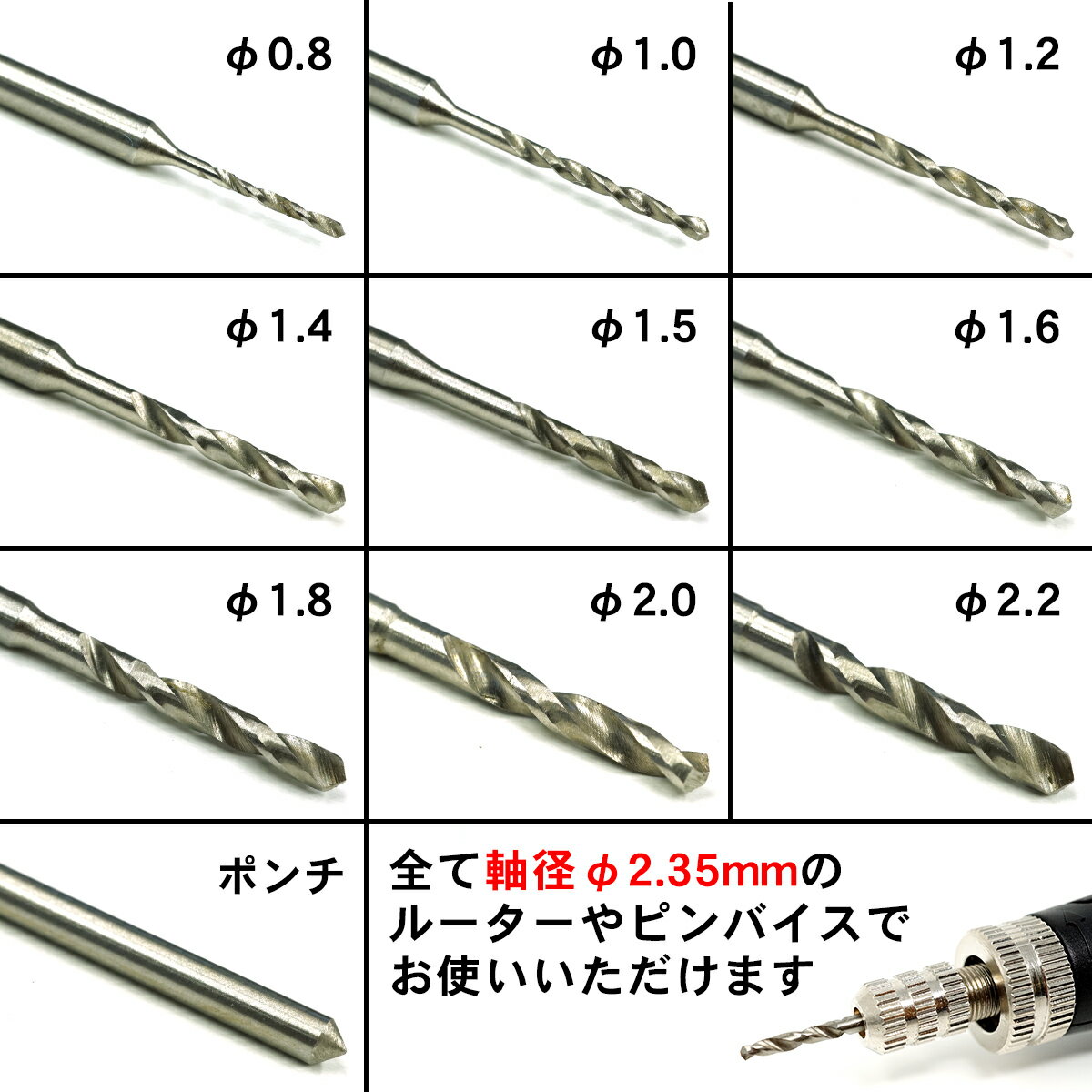 【商品ポイント5倍!】 ミニルーター用 精密 マイクロドリル刃 10本組 (0.8-2.2mm) 軸径2.35mm 極細 ドリル ピンバイス ビット 精密ポンチ付き レジン プラモデル 模型 アクリルなどの穴あけに
