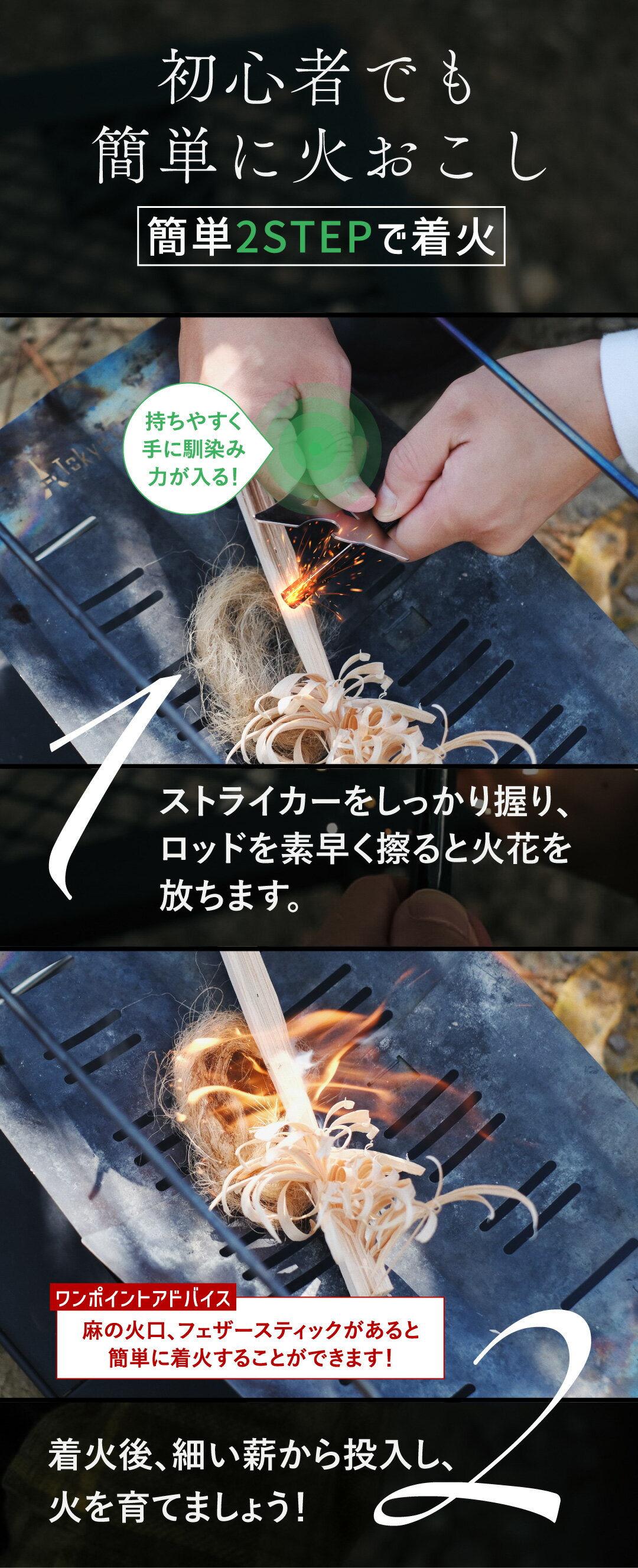 【TokyoCamp”イグナイトタワー”】 TokyoCampイグナイトタワーは、スタイリッシュさと機能性を兼ね備えたファイヤースターターです。 どんな環境でも信頼できる火種を提供し、ブランドロゴをかたどった独自のストライカーは、使いやすさとデザイン性の両方を追求した形状で、アウトドアシーンをより特別なものにします。 専用の軽量カラビナ付きで、バッグやベルトループに簡単に装着可能。 いつでも手元に置けるため、緊急時やアウトドアでの安心の備えとなります。 【試行錯誤を重ねた理にかなった形状】 ストライカーは何度も試行錯誤を重ねた末、手に馴染み、火花を飛ばしやすい形状に仕上げました。力を入れやすく、火起こしが簡単なため、だれでも安全に使用できる設計です。また、このデザインはアクセサリーとしても映え、使わない時でもスタイリッシュなチャームとしてお楽しみいただけます。 【高品質素材で長持ち設計】 ストライカーは錆びに強いステンレス、火花の安定したフェロセリウム合金ロッド、軽量アルミ製のカラビナで構成されており、長期間の使用にも耐えます。ロッドは長さや形状も最適化され、六角形のデザインが角を使ったスムーズな摩擦を可能にし、より強力な火花を放ちます。また、栓抜きとしても使える多機能性を備えています。 【どんな環境でも火を起こせる信頼感】 イグナイトタワーは、風や湿気のある環境でも安定した火花を生み出せるため、雨の日や風が強い日でも使用可能です。ライターやマッチでは難しい状況でも確実な火種を提供し、アウトドアや災害時にも頼れるツールです。 【緊急時の安心感】 イグナイトタワーは、火を起こすことで食事の準備、暖を取る、救助の合図を送るなど、多目的に活用できます。災害や緊急時に心強い存在であり、アウトドア愛好家にとっては安心感を提供するパートナーです。 【コンパクト設計】 必要最小限のサイズと軽さで、気軽に持ち運べる設計です。バッグやポケットに収まるサイズ感で、持ち運びの負担が少ないことも魅力のひとつです。 【緊急時の安心感】 火が起こせることで、食事の準備や暖を取るだけでなく、夜間の照明や救助の合図にも役立ちます。持っているだけで、野外での緊急時に備えた安心感が得られます。TokyoCampイグナイトタワーで、アウトドアをさらに快適・安心に。風や湿気に強い火打ち道具として、キャンプ、登山、釣り、そして災害時にも頼れるパートナーです。