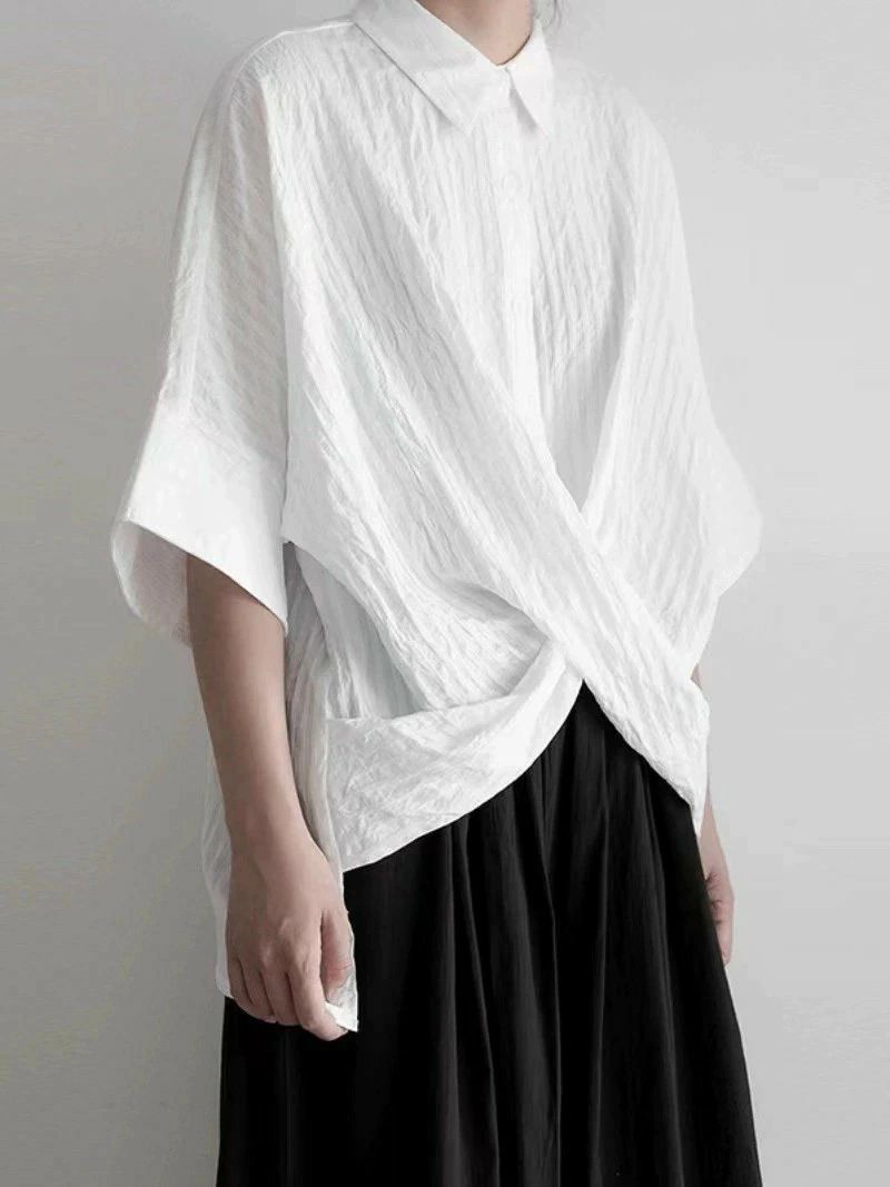 可愛い 大人 夏 春 薄手 ベーシック ゆったり 黒 白 無地 折襟 前開き 綿混 白シャツ 裾クロス カジュアル 大きいサイズ シャツ