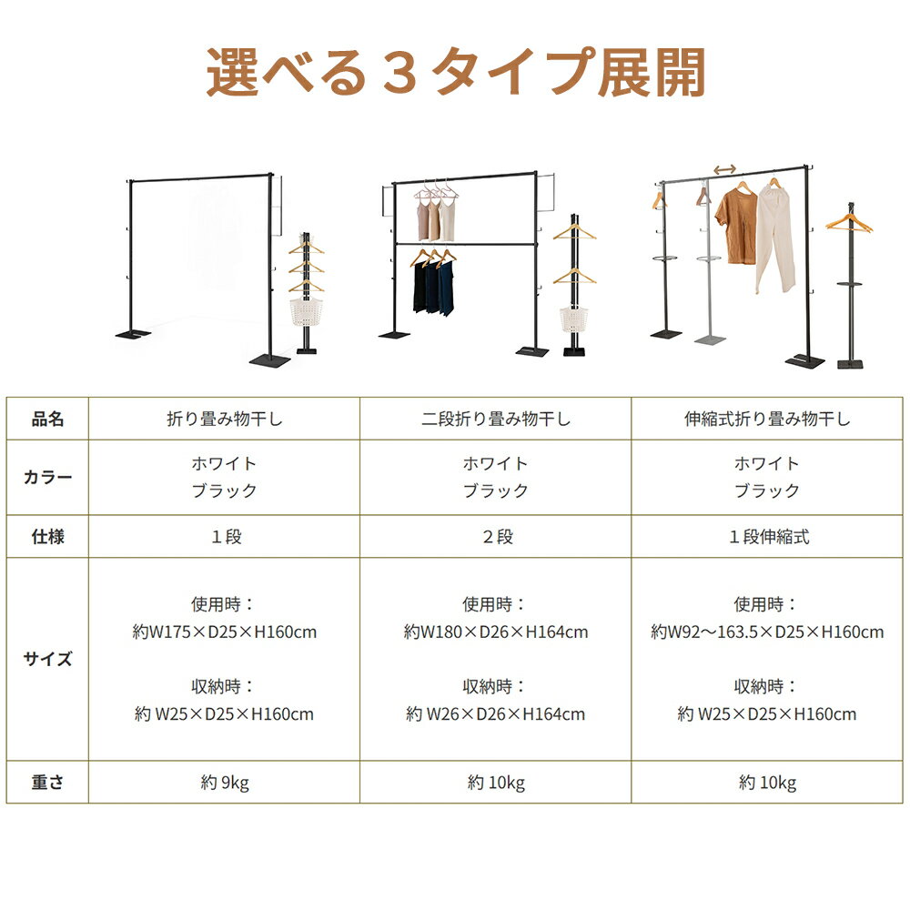 品名折り畳み室内物干しカラーホワイト ブラック仕様一段折り畳み物干し(通常タイプ) 二段折り畳み物干し(強化ベース仕様) 伸縮式折り畳み物干し(通常タイプ)サイズ使用時: 一段折り畳み物干し:約W175×D25×H160cm 二段折り畳み物干し:約W180×D26×H164cm 伸縮式折り畳み物干し:約W92~163.5×D25×H160cm 収納時: 一段折り畳み物干し:約 W25×D25×H160cm 二段折り畳み物干し:約 W26×D26×H164cm 伸縮式折り畳み物干し:約 W25×D25×H160cm素材鉄( 粉体塗装 )商品説明【折り畳み物干しスタンドの一台三役】二段横棒の取り外し可能で、必要によってダブルボール(二段)モード でかさばる洗濯物を効率的にほせます。シングルボール(一段)モードで、大きい衣類や厚手のアイテムなど、かさ高い衣類を広々と干せます。折り畳んでクローゼットやドアの裏に収納可能でコートハンガーにも使えます。 【折り畳んで収納可能】横棒を折り畳むことで、ポールハンガーの形にして、物干しスタンドの横幅を極限までコンパクトにできます。クローゼットや物置の狭い隙間、ベランダの片隅など、最小限のスペースで収納可能で、コートやカバンをかけるにも便利です。 引越しの際や掃除のため一時的に片付ける時、コンパクトになるので運びやすく、保管も楽です。 【重みがあって安定性がある】鉄製の重量感があって合わせて10kgの重量で、突風や揺れに強く、ベランダ干しでも安心です。ぐらつきゼロで、洗濯物を多く載せても、重心が安定し倒れにくいです。布団・毛布・大量の衣類を無理なく干せます。 【室内で物を干す様々なシーンに適用】洗濯物を干すために使用することができ、また、布団を干す時にも、収納してコートやカバンをかけるにも便利です。リビングやベッドルームなど、様々な場所で使用することができます。シンプルでスタイリッシュなデザインも、部屋のインテリアに馴染みやすいです。 【組み立て簡単】スタンドの組み立ては非常に簡単です。一人で簡単に組み立てることができ、時間もかかりません。そのため、すぐに使用を開始することができ、手間がかかりません。弊店からお買い上げいただいた製品に対しては、1年間のメーカー保証が付きますので、商品に何らかのご不備などがありましたら、いつでもご連絡ください。