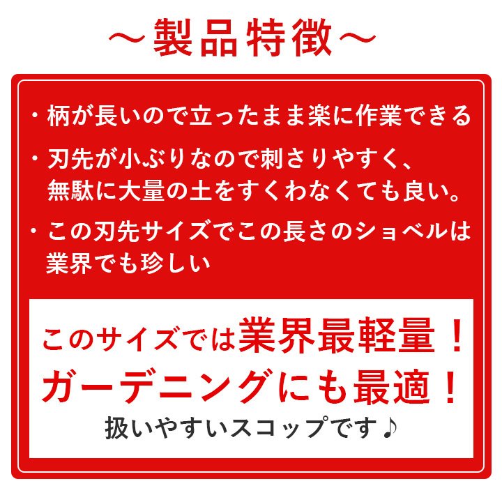 [全 長]970 mm [刃先長]巾 165 × 長 230 mm [重 量]750 g [材 質]握り部:アルミ合金 柄管:アルミ合金 刃先:ショベル鋼板(スチール製) ・握り部・柄管はアルミ合金を使用する事で軽量化に成功!(一度使うと、この軽さはやみつき) ・刃先はショベル鋼板を使用し完璧な熱処理加工のため丈夫。 ・カラフルな色を使用する事により個人別、用途別に識別し易い。 ・好みの色でラクラク作業。場所は日時で気分転換。 ・ショベルの一般的な長さを保ちつつ、刃先は小ぶりで腰にも腕にも楽に作業が出来る 商標登録済