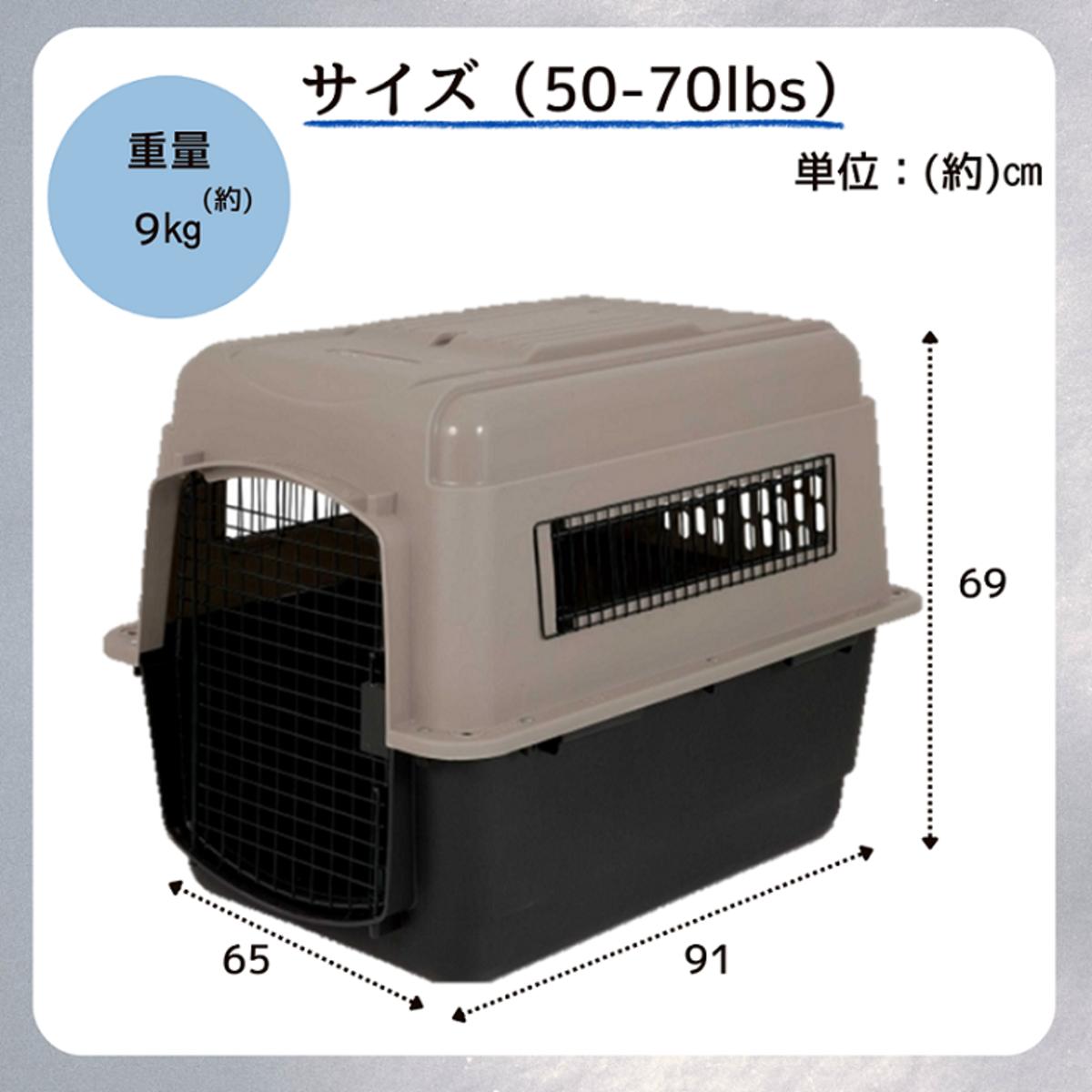 ペットメイト ウルトラバリケンネル 400 Lサイズ 50-70lbs (22.7-31.7kg) トープ/ブラック 中型犬・大型犬用数多くの愛犬家、ブリーダー達が愛用しているキャリー、ウルトラバリケンネル。丈夫で安定感があり、わんこが安心・安全に過ごせるよう設計されています。重ねてコンパクトに畳む事ができます。材質本体:ポリプロピレンドア:スチールスペック外寸:幅65×奥行91×高さ69cm内寸:幅56×奥行76×高さ67cm底面内寸:幅48×奥行73cm重量:約9kg耐荷重:31.7kg※ドアは通常写真の開きに取り付けますが、逆の開きにも取り付けは可能です。※背面通気穴あり※商品寸法は多少の誤差が生じます。あらかじめご了承ください。犬種目安レトリバー、ボクサー、エアデールテリア、ハスキー、プードル など※犬種はあくまでも目安です。個体差がございますので犬種目安の限りではないことをご了承ください。その他/注意等50-70lbsには、取っ手が付いておりません。底面はフラットではありません。ドア・本体・格子・通気口の形状や色などは、予告なく変わる場合がございます。あらかじめご了承ください。成型時に樹脂のバリや色むらが出る場合がございます。 または、キズ・汚れが有る場合があります。あらかじめご了承ください。IATA基準をクリアしております。飛行機でご利用の際は、各航空会社にご確認ください。背面の穴有り/無しはロットによって変わる場合がございます。ご了承ください。ウルトラバリケンネル本体に、ドア・ネジは含まれております。別売りのドア・ネジは、ご利用によって破損などがあった場合の交換用です。原産国アメリカ