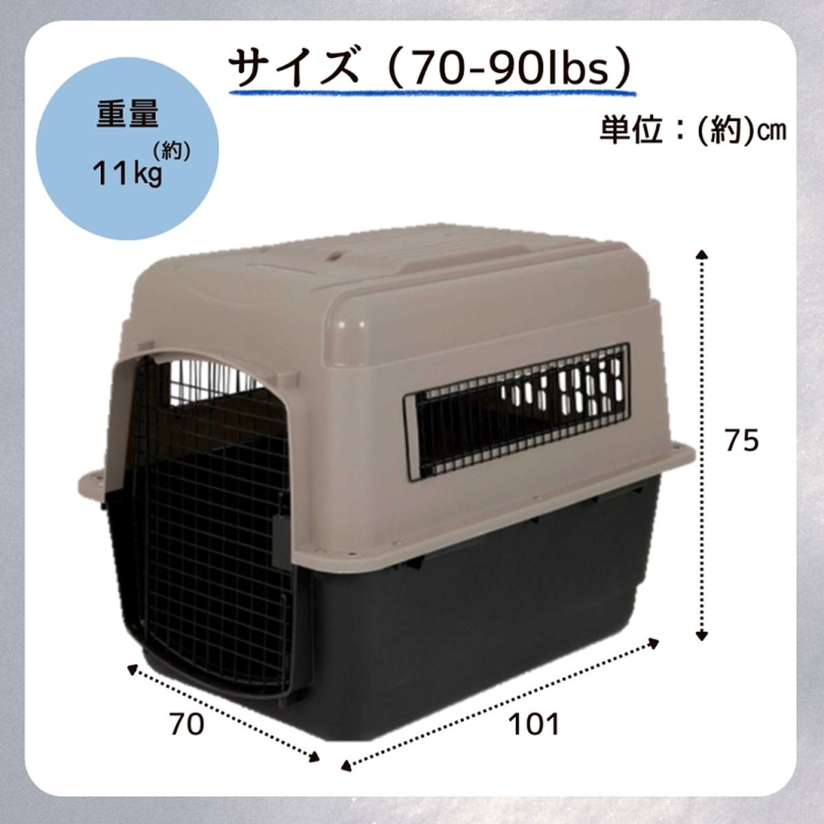 ペットメイト ウルトラバリケンネル 500 XLサイズ 70-90lbs (31.7-40.8kg) トープ/ブラック 大型犬用 ×2台入※当商品の通気孔(網部分)は、現在「タイプ1」「タイプ2」の2種類がございます。お届けする商品のタイプはお選びいただけませんので、あらかじめご了承の上、ご購入くださいませ。数多くの愛犬家、ブリーダー達が愛用しているキャリー、ウルトラバリケンネル。丈夫で安定感があり、わんこが安心・安全に過ごせるよう設計されています。重ねてコンパクトに畳む事ができます。材質本体:ポリプロピレンドア:スチールスペック外寸:幅70×奥行101×高さ75cm内寸:幅60×奥行85×高さ72cm底面内寸:幅52×奥行82cm重量:約11kg耐荷重:40.8kg※ドアは通常写真の開きに取り付けますが、逆の開きにも取り付けは可能です。※背面通気穴あり※商品寸法は多少の誤差が生じます。あらかじめご了承ください。犬種目安ハスキー、バーニーズマウンテン、ジャーマンシェパード、レトリバー、アイリッシュセター、ドーベルマン、ロットワイラー など※犬種はあくまでも目安です。個体差がございますので犬種目安の限りではないことをご了承ください。その他/注意等70-90lbsには、取っ手が付いておりません。底面はフラットではありません。ドア・本体・格子・通気口の形状や色などは、予告なく変わる場合がございます。あらかじめご了承ください。成型時に樹脂のバリや色むらが出る場合がございます。 または、キズ・汚れが有る場合があります。あらかじめご了承ください。IATA基準をクリアしております。飛行機でご利用の際は、各航空会社にご確認ください。背面の穴有り/無しはロットによって変わる場合がございます。ご了承ください。ウルトラバリケンネル本体に、ドア・ネジは含まれております。別売りのドア・ネジは、ご利用によって破損などがあった場合の交換用です。原産国アメリカ