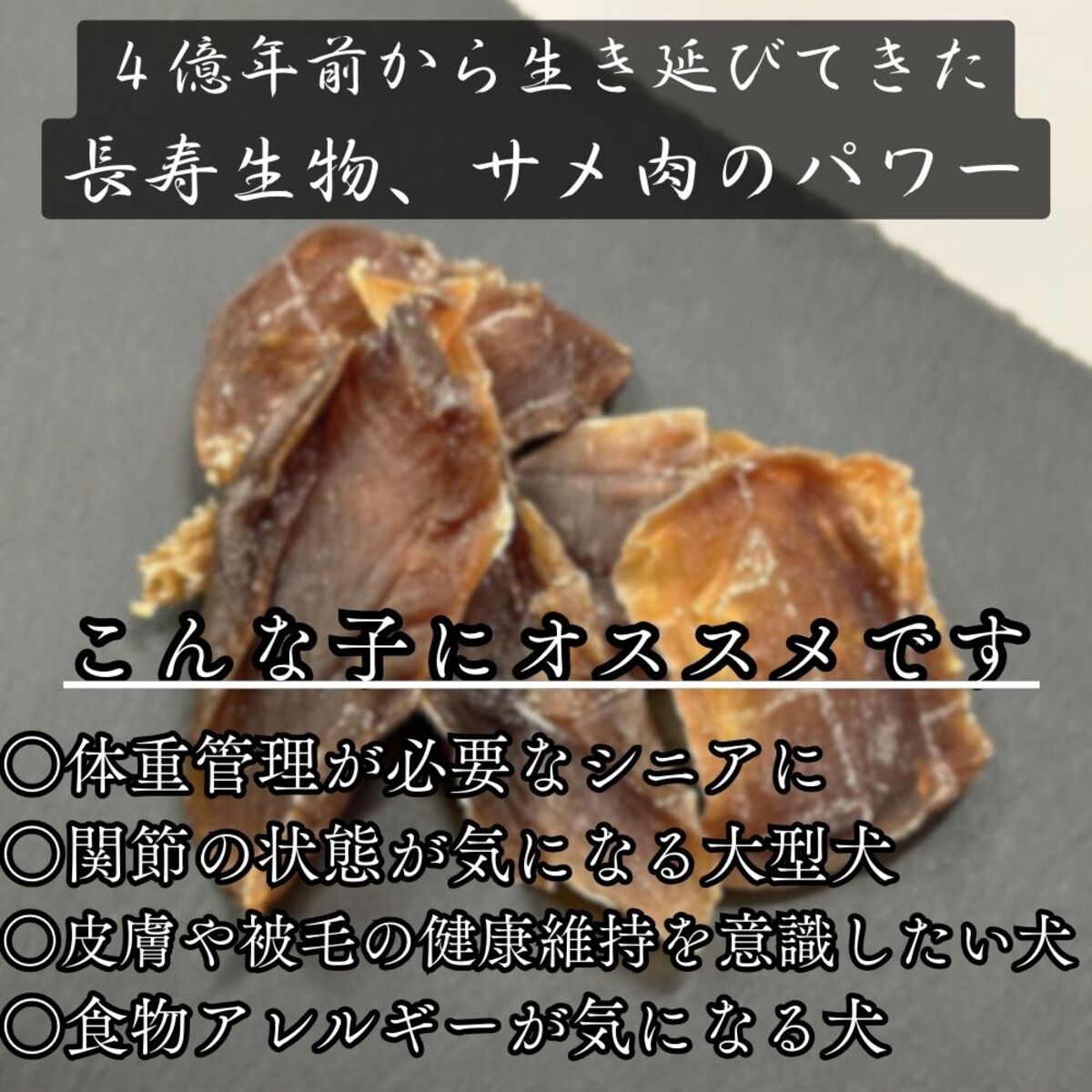トムキャット 気仙沼産 サメジャーキー 犬・猫用 犬・猫おやつ【20gと100gの商品は、基本的にメール便での発送となる為、代引き・日時指定・他の商品との同梱は致しかねますので予めご了承ください。】 《複数ご購入された際の配送方法》 メール便のみのご注文の場合はポストイン配送になりますが、〈メール便配送物〉と〈宅配便配送物〉が混在したご注文の場合はまとめて宅配便での配送になります。 また、他の商品との同梱が不可の商品が混在したご注文の場合は別々に発送させていただきます。生後6ヶ月未満のワンちゃんネコちゃんには与えないでください。気仙沼港に水揚げされたアオザメを使用しています。サメ肉にはビタミンAなども含まれますので、瞳、皮膚や粘膜の健康維持をサポート。無着色、無香料、保存料無添加。商品概要高たんぱく、低脂肪、低カロリーなので体重が気になるワンちゃん・ネコちゃんにも安心して与える事ができます。ビタミンB6を多く含み、血管の働きをサポート、さらに体調維持にも有効性が期待されます。ビタミンB12も多く、造血機能をサポート。EPA・DHAが豊富で、脳の健康をサポート。少し硬めのジャーキーのため、噛むことでデンタルケア効果も期待できます。原材料アオザメ主成分粗蛋白質:73.6%以上粗灰分:2.3%以下水分:13%以下粗脂肪:0.9%以上粗繊維:0.4%以下カロリー292kcal/100gその他/注意等色・硬さ・形・臭いに若干の違いがある場合がございますが品質に問題はありません。与えすぎに注意してください。ワンちゃんの習性、食べ方によっては、のどに詰まらせたりする恐れがあります。ワンちゃん・ネコちゃんに合った大きさにして観察しながら与えてください。子供がペットに与える時は、安全の為大人が立ち会ってください。保存方法直射日光、高温多湿を避けてください。開封後はなるべく早く与えてください。原産国日本