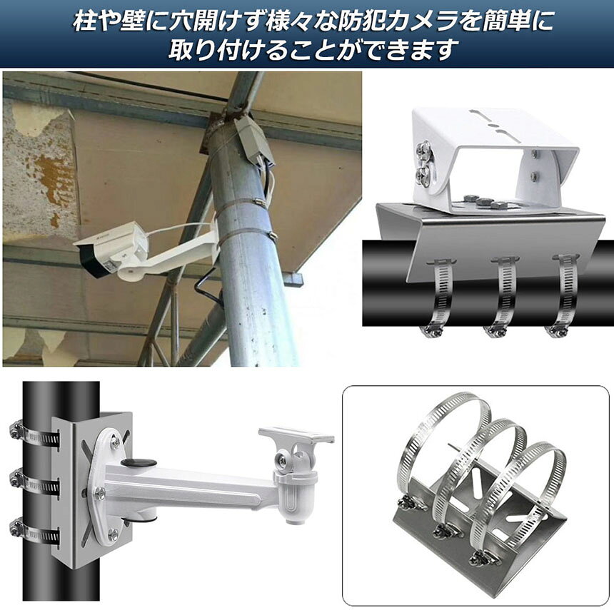 ステンレス製取り付け金具。1個当たり直径20cmのステンレスバンド3本付き。ステンレスバンド長さは62cm。防犯カメラハウジングをポールやコンクリート柱などにネジ止めをしないで(構造体に穴をあけずに)、設置するための軽くて丈夫な取付金具(ブラケット)です。穴あけ・ビス止め不要!付属のステンレス製バンドで円柱、角柱の両方にしっかり固定できます。格子状のベランダやフェンスなどへの取り付けにも使用できます。直径約5cmから19cmまでのポールへの取付けに対応します。(付属ステンレスバンド使用時)空き巣や車上荒らしなどの対策として、ご家庭やオフィス、街頭の防犯にお役立てください。【セット内容】取付金具1台、1個当たりステンレスバンド3本