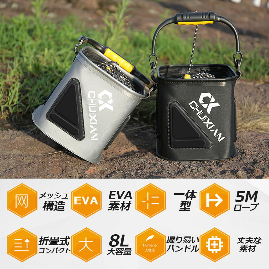 釣り バケツ バッカン 水汲み みずくみバケツ 釣り 折りたたみ バケツ 8L チャック付き 魚が逃げない ロープ 5m EVA 海釣り 生かしバケツ 釣り 水くみバケツ アウトドア コンパクト