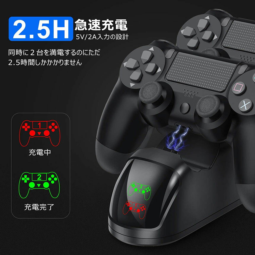 【安定性】PS4 コントローラー 充電器はPS4コントローラーがしかっりと嵌り、定感抜群の横置きスタンドとして収納できます。さらに底面に滑り止めのゴムを配置して、安定性を確保しています。【過充電防止】充電スタンドは過充電を防止する装置が搭載しており、PS4コントローラーが満充電してから、電源を自動的に切ります。【高速充電】DUALSHOCK4充電器は充電アダプター(5V/2A)を利用して、2時間をかかります、同時に2台を満タン充電できます。【LED 指示ランプ】PS4 コントローラー 充電器LED指示ランプを配置していますので、別々にコントローラーの充電状況をより直観的に見えます。【コンパクトに収納】PS4 充電 スタンドはPS4コントローラーがしかっりと嵌り、定感抜群の縦置きスタンドとして収納できます。さらに底面に滑り止めのゴムを配置して、安定性を確保しています。製品のご紹介本体はPS4 コントローラーを充電するために設計されている製品です。このPS4 コントローラー充電スタンドは2台同時に充電することが可能です。通電後、PS4コントローラーの充電状況を非常に直観的に見てできます。基準的なDC5Vを採用し、PS4ホストやPCやほかの5VアダプタなどのUSBポートに電源を入れることは可能です。製品仕様電力供給:USB 5V充電時間:2時間サイズ:174x59x55mm付属品:USB ケーブル(80cm)
