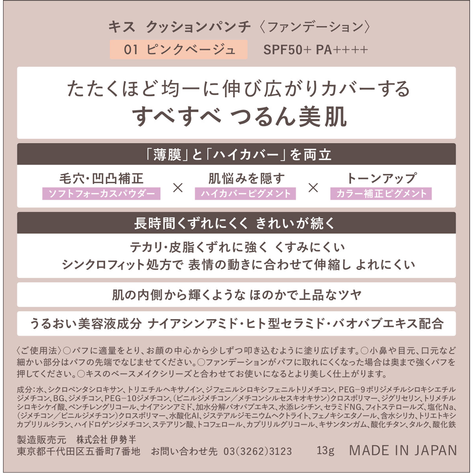 “トントン”やわらかパンチで均一な薄膜へSPF50+ PA++++たたくほど均一に伸び広がりカバーするすべすべ つるん美肌○「薄膜」と「ハイカバー」を両立毛穴・凹凸補正[ソフトフォーカスパウダー]肌悩みを隠す[ハイカバーピグメント]トーンアップ[カラー補正ピグメント]○長時間くずれにくくきれいが続くテカリ・皮脂くずれに強く くすみにくいシンクロフィット処方で 表情の動きに合わせて伸縮し よれにくい肌の内側から輝くような ほのかで上品なツヤうるおい美容液成分 ナイアシンアミド・ヒト型セラミド・バオバブエキス配合表示成分<成分>水、シクロペンタシロキサン、トリエチルヘキサノイン、ジフェニルシロキシフェニルトリメチコン、PEG-9ポリジメチルシロキシエチルジメチコン、BG、ジメチコン、PEG-10ジメチコン、(ビニルジメチコン/メチコンシルセスキオキサン)クロスポリマー、ジグリセリン、トリメチルシロキシケイ酸、ペンチレングリコール、ナイアシンアミド、加水分解バオバブエキス、水添レシチン、セラミドNG、フィトステロールズ、塩化Na、(ジメチコン/ビニルジメチコン)クロスポリマー、水酸化Al、ジステアルジモニウムヘクトライト、フェノキシエタノール、含水シリカ、トリエトキシカプリリルシラン、ハイドロゲンジメチコン、ステアリン酸、トコフェロール、カプリリルグリコール、キサンタンガム、酸化チタン、タルク、酸化鉄用法・用量/使用方法<ご使用法>○パフに適量とり、お顔の中心から少しずつ叩き込むように塗り広げます。○小鼻や目元、口元など細かい部分はパフの先端でなじませてください。○ファンデーションがパフに取れにくくなった場合は奥まで強くパフを押してください。○キスのベースメイクシリーズと合わせてお使いになるとより美しく仕上がります。
