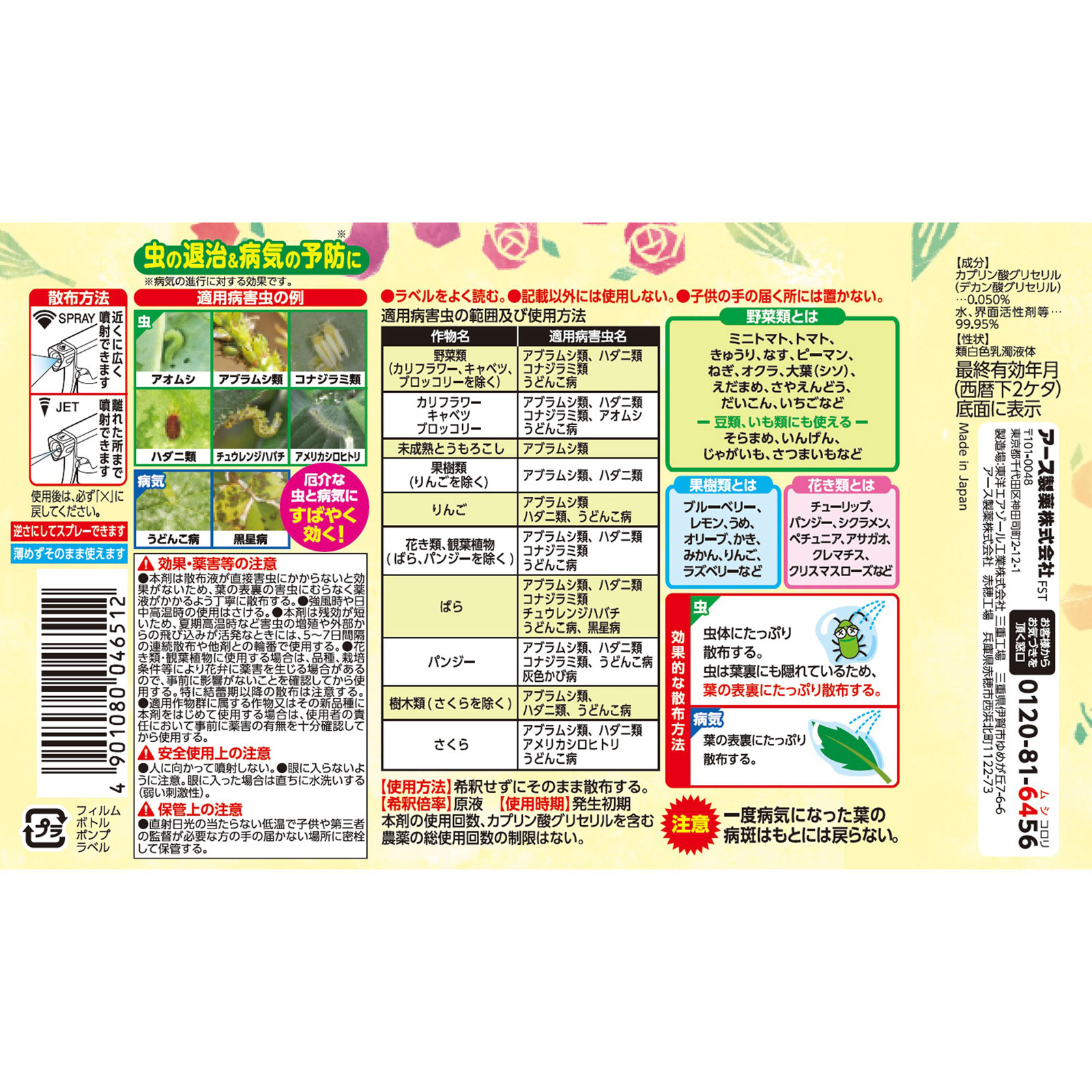 虫・病気に殺虫殺菌剤 家庭園芸用カプリン酸グリセリル乳剤食品原料99.9%収穫当日まで何度でも野菜・果樹・花・庭木にアオムシ・アブラムシ・コナジラミ・ハダニ・うどんこ病・黒星病・灰色かび病逆さにしてスプレーできます薄めずそのまま使えます虫の退治&病気の予防※に※病気の進行に対する効果です。○適用病害虫の例・虫アオムシ、アブラムシ類、コナジラミ類、ハダニ類、チュウレンジハバチ、アメリカシロヒトリ・病気うどんこ病、黒星病厄介な虫と病気にすばやく効く!【希釈倍率】原液【使用時期】発生初期本剤の使用回数、カプリン酸グリセリルを含む農薬の総使用回数の制限はない。○野菜類とはミニトマト、トマト、きゅうり、なす、ピーマン、ねぎ、オクラ、大葉(シソ)、えだまめ、さやえんどう、だいこん、いちごなど・豆類、いも類にも使えるそらまめ、いんげん、じゃがいも、さつまいもなど○果樹類とはブルーベリー、レモン、うめ、オリーブ、かき、みかん、りんご、ラズベリーなど○花き類とはチューリップ、パンジー、シクラメン、ペチュニア、アサガオ、クレマチス、クリスマスローズなど【性状】類白色乳濁液体表示成分<成分>カプリン酸グリセリル(デカン酸グリセリル)・・・0.050%水、界面活性剤等・・・99.95%用法・用量/使用方法<散布方法>SPRAY 近くに広く噴射できますJET 離れた所まで噴射できます使用後は、必ず「×」に戻してください。<適用病害虫の範囲及び使用方法>○野菜類(カリフラワー、キャベツ、ブロッコリーを除く):アブラムシ類、ハダニ類、コナジラミ類、うどんこ病○カリフラワー、キャベツ、ブロッコリー:アブラムシ類、ハダニ類、コナジラミ類、アオムシ、うどんこ病○未成熟とうもろこし:アブラムシ類○果樹類(りんごを除く):アブラムシ類、ハダニ類○りんご:アブラムシ類、ハダニ類、うどんこ病○花き類、観葉植物(ばら、パンジーを除く):アブラムシ類、ハダニ類、コナジラミ類、うどんこ病○ばら:アブラムシ類、ハダニ類、コナジラミ類、チュウレンジハバチ、うどんこ病、黒星病○パンジー:アブラムシ類、ハダニ類、コナジラミ類、うどんこ病、灰色かび病○樹木類(さくらを除く):アブラムシ類、ハダニ類、うどんこ病○さくら:アブラムシ類、ハダニ類、アメリカシロヒトリ、うどんこ病<使用方法>希釈せずにそのまま散布する。<効果的な散布方法>○虫虫体にたっぷり散布する。虫は葉裏にも隠れているため、葉の表裏にたっぷり散布する。○病気葉の表裏にたっぷり散布する。