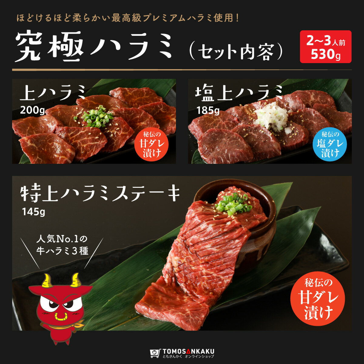 究極ハラミ 530g 2〜3人前 3種セット 秘伝のタレ付き はらみ 牛肉 焼肉 バーベキュー BBQ 送料無料