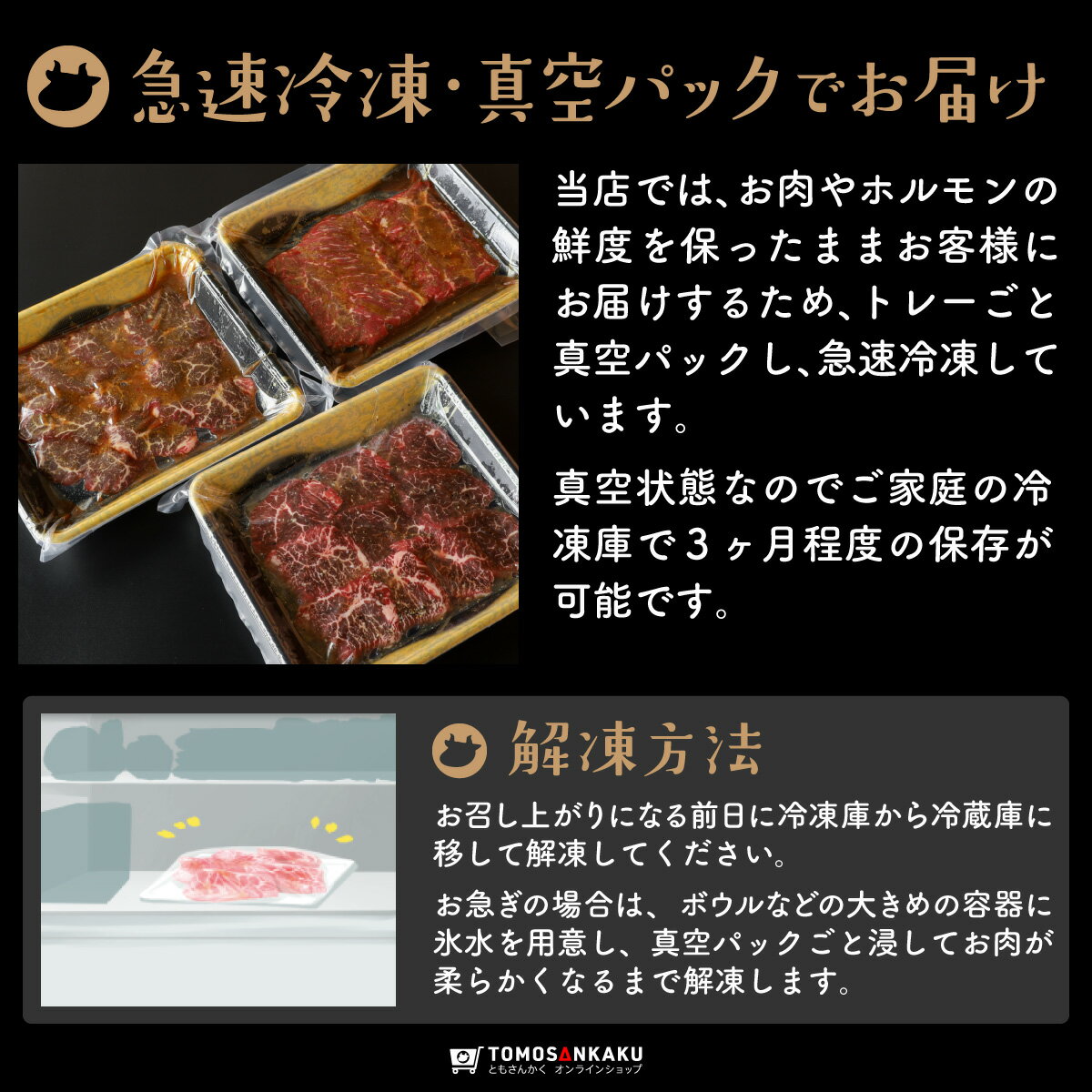 ■焼肉店の本格牛ハラミ 秘伝のタレに漬け込んだ2種の上ハラミと、特上ハラミステーキの3種をご賞味頂けます。 ■セット内容 ・上ハラミ 200g 秘伝の甘ダレに漬け込んだ当店人気No.1の上ハラミ。ほどけるほど柔らかくジューシー! ・塩上ハラミ 185g 秘伝の塩ダレに漬け込んだ上ハラミ。甘ダレよりもさっぱりとした味わいで、ほんのりにんにくが効いた味付けがクセになります。 特上ハラミステーキ 145g 上ハラミの一番ぶ厚く柔らかい肉質の良い部分のみを使用。当店の肉職人が丁寧に捌いて大判のステーキに仕上げています。 秘伝の甘ダレに漬け込んでいますのでそのまま焼いて、一口サイズにカットしてお召し上がりください。 ■冷凍庫で長期保存が可能! それぞれ小分けして真空冷凍されていますので、一度に食べきれない場合は、冷凍庫で長期保存が可能です。 ■秘伝の甘ダレ付き! 当店の甘ダレは、大人から子供まで誰からも愛される味わいに仕上げております。 ■内容量 2〜3人前 530g ■原材料 牛ハラミ 産地名:アメリカ/ウルグアイ ■消費期限:商品到着から3ヶ月 ■保存方法:冷凍庫で保存 ■加工業者:(株)CK JAPAN(千葉県松戸市松戸新田30-44 松戸南部市場U棟)