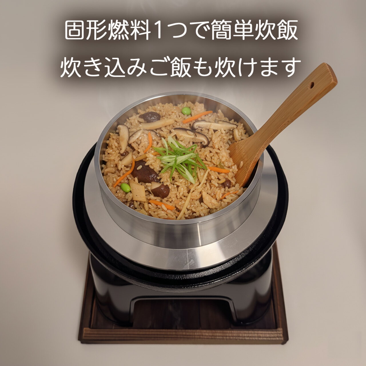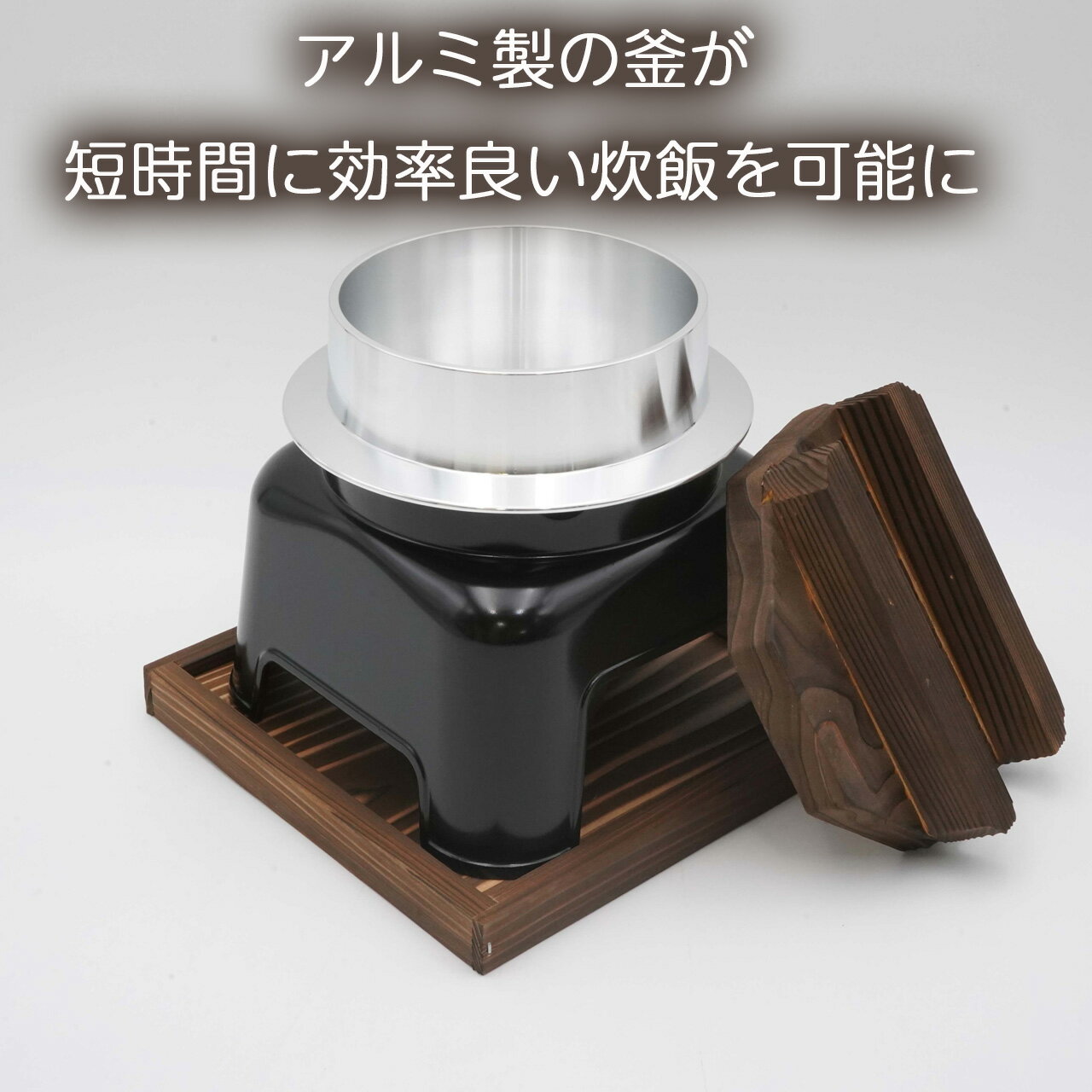 釜 かま おいしい 美味しい ごはん 1合炊き 銀シャリ 固形燃料で炊ける 料亭気分 アウトドア お祝い お手入れ簡単 羽釜炊き 本格的 カマド 1合炊き 一人前 アルミ製 軽量 錆びない 黒塗り 高級感 熱伝導率 自動炊飯 簡単調理 固形燃料 火が消えるまで 旅館風 おうちご飯 キャンプ グランピング フッ素加工 汚れ落ち ふっくら 高火力 保温力 対流 高岡市 段付き木蓋 贅沢砺波商店 羽釜炊きカマドセット 1合炊き(黒) 固形燃料1つでご飯が炊ける 割れない 欠けない アウトドアでも使える アルミ合金製釜 しゃもじ 固形燃料付き ご家庭やアウトドアで手軽に本格的な釜めしを!固形燃料1つで簡単に「かまどのご飯」を味わえます。 【羽釜炊きカマドセット 1合炊き 特徴】1. 優れた熱伝導のアルミ合金製本体の釜はアルミ製で、鉄や土鍋に比べて非常に熱伝導率が高いのが特徴です。熱が釜全体に素早く均一に伝わるため、炊きムラが少なく、お米一粒一粒がふっくらと炊き上がります。 2. 固形燃料一つで自動炊飯br>卓上コンロなどで使われる市販の固形燃料(25g~30g)を一つ使うだけで、火加減の調整なしでご飯が炊き上がります。火が消えたら炊き上がりの合図という手軽さで、初心者でも失敗なく美味しいご飯が炊けます。3. 趣のある焼杉の木蓋とカマド木蓋やカマド、敷板には焼杉が使われており、見た目にも高級感と和の趣があります。木蓋は気密性を高め、蒸気をしっかり閉じ込めることで、ご飯を美味しく炊き上げ、保温する効果もあります。4. 軽量で持ち運びやすいアルミ製なので土鍋などに比べて軽量です。ご家庭での使用はもちろん、キャンプやバーベキューなどのアウトドアシーンにも手軽に持ち運んで使用できます。5. しゃもじに加えて「固形燃料」もついています!ご飯を炊くのに必要な固形燃料もセット(25gを3個)していますので、お米を用意していただければすぐに釜めしを作ることができます。6. 美味しいご飯を簡単に炊ける「マニュアル」つき初めて使用されるときも、使い方に困ることがありません。 さらにこんな魅力も!1. 「旅館の味」をご家庭で再現できる特別感最大の魅力は、旅館や専門店で食べるような、一人前ずつ炊き上げる釜めしの特別感を自宅で手軽に味わえることです。目の前で炊き上がっていく様子を楽しみながら、炊きたての一番美味しい状態で食べることができます。2. ふっくらご飯と絶品おこげが楽しめる優れた熱伝導と密閉性の高い構造により、お米の芯までしっかり熱が通り、甘みが引き出されたふっくらとしたご飯が炊けます。また、底には香ばしい「おこげ」もでき、釜めしならではの醍醐味を存分に楽しめます。3. 準備から片付けまで驚くほど簡単 「固形燃料に火をつけるだけ」という手軽さが、多くのお客さまに支持されています。火加減をずっと気にする必要がないため、他の料理をしながらでも調理可能です。4. 白米から炊き込みご飯までアレンジ無限大季節の野菜や鶏肉、魚介類などを加えて、オリジナルの炊き込みご飯(釜めし)を手軽に作ることができます。レシピ次第で様々な味を楽しめるため、食卓が豊かになり、おもてなし料理としても活躍します。 商品名 砺波商店 羽釜炊きカマドセット 1合炊き(黒) 品番 80001 セット内容 木蓋、羽釜(お釜)、カマド、火皿、敷板、しゃもじ、固形燃料(25g×3個)、炊き方マニュアル サイズ 外側(外寸):縦19.0cm横19.0cm高さ21.5cm 釜内側(内寸):直径11.5cm高さ8.0cm 重量 1,400グラム(しゃもじ、固形燃料除く) 容量 750cc 材質 アルミ合金(羽釜、カマド、火皿)木材(焼杉仕様)(木蓋、敷板)プラスチック(しゃもじ) 内面仕上 無塗装 外面仕上 無塗装 アルミ表面磨き 原産地 日本(富山県) 備考 <お手入れ方法/注意事項> ・アルミ箔付きの固形燃料をお使いの場合は、アルミ箔を剥いだうえで付属の「火皿」を使用してください。・羽釜やハカマの表面に仕様上磨きの際に生じた曇りが存在する場合があります。 ・はじめてご使用になる時は、中性洗剤でよく洗い、乾燥後ご使用ください。・食洗機はご利用いただけます。ただし、中性洗剤をご利用ください。アルカリ性の洗剤をご利用になられますと、黒っぽく変色したり、白い粉のようなものが出てくることがあります。塗装膜の剥がれにもつながります。また、木蓋、敷板は手洗いの上、よく水を切って陰干しすることをおすすめします。・電子レンジ、オーブン、IHはご利用いただけません。・金属製のへら等の調理器具は使用しないでください。 竹や木・プラスチック製などの物をご使用ください。 ・アルミ箔つきの固形燃料をご使用の場合は、アルミ箔をはがしたうえで火皿にいれてお使いください。・本品はアルミ製のため、熱伝導率に優れています。炊き立ては高温になっておりますので、「やけど」にご注意ください。・撮影の関係上、実際の色見と若干異なる可能性がございますこと、ご了承ください。
