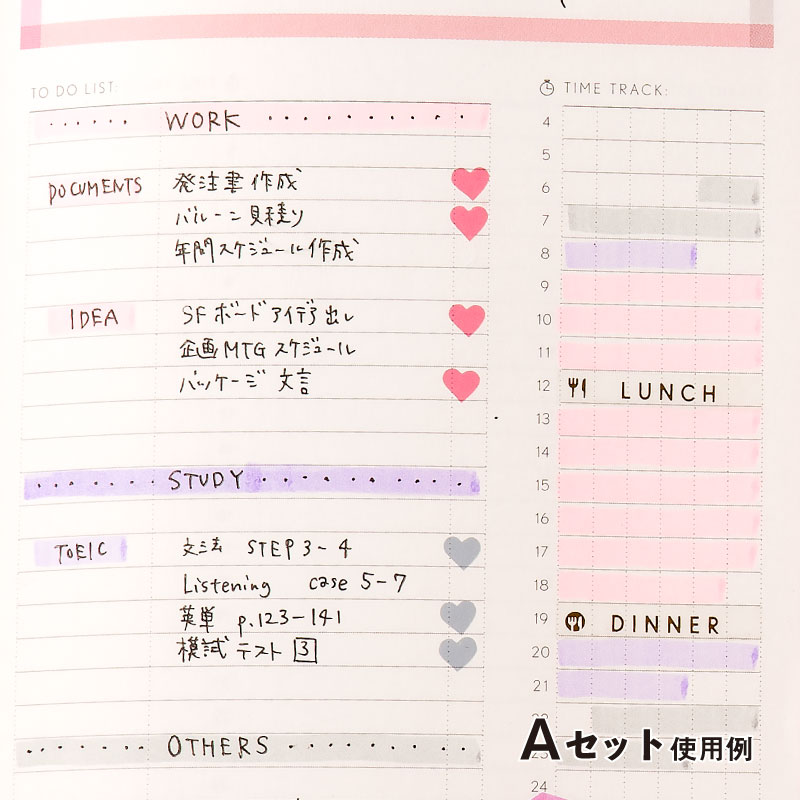 セット内容 マイルドライナー×3※カラーはセット内容に準ずる サイズ 軸径11.5mm × 全長141.5mm 線の太さ 太4mm細1.0~1.4mm インク 水性顔料 andstudium あんすた アンスタ アンドスタディウム スタディープランナー すたぷら STUDY PLANNER スタプラ スタディプランナー 韓国 書き方 手書き 学生 高校生 大学生 中学生 小学生 受験生 受験 勉強 学習 社会人 おすすめ 人気 シンプル 可愛い かわいい おしゃれ 使い方 ルーズリーフ ノート ペン ステショ ステーショナリー 文具 文房具 ふせん 付箋 大人 効果 仕事用 主婦 種類 シール スマホ とじノートタイプ 比較 値段 筆箱 ペンケース マーカー ロール付箋 ロールフセン 使いやすい バインダー ノート A5 B5 手帳 カバー メモ帳 方眼 リングノート マルチポーチ ツールポーチ ポーチ 収納 整理 整理整頓 持ち運び 授業 ペン カラーペン マーカー ウィークリー マンスリー ケース フラットポーチ フラットケース 単語帳 shiirerkp250904ショップトップ > カテゴリトップ > ステーショナリー(文房具) > 文具雑貨 マイルドライナー スタプラ部おすすめ3本セット マイルドライナーとは、Instagramの勉強垢で大人気の蛍光ペン。 ZEBRA社製で、マイルドでかわいい淡い色味、目がチカチカしにくいインク色が特徴です。 スタディプランナーのユーザーさんにも愛用者が多いペンなので、このたびスタプラ部でオススメカラーの3本セットを作りました! ※スタプラ部とは、勉強垢さんの応援や商品開発を行うInstagram上の活動です。 マイルドライナーがあれば、教科や項目ごとに色を使い分けたり、お気に入りのカラーでマークしたり、勉強専用の手帳「スタディプランナー」をもっとかわいく見やすく使うことができますよ◎ スタプラ部おすすめ3本セット〈A〉 カラー:マイルドバイオレット/マイルドグレー/マイルドピンク 《Aセットおすすめポイント!》 ・スタディプランナーに使っているピンク・グレーと色合いが近いのでスタディプランナーをより可愛く使えます! ・グレーは勉強でない学校の時間など、オフの時間の色として使いやすいです♪ ・バイオレットはスタプラ部1期生の使いやすいとの声が多かったカラーです。 スタプラ部おすすめ3本セット〈B〉 カラー:マイルドダークブルー/マイルドマゼンタ/マイルドゴールド 《Bセットおススメポイント!》 ・3色で科目ごとや項目ごとに色分けするととても分かりやすく記録できます。 ・この3色は他のマーカーペンにはあまりない色なので、おしゃれに楽しめます♪ ・くっきりした色合いなので写真にとってもかわいいです! スタプラ部おすすめ3本セット〈C〉 カラー:マイルドダスティピンク/マイルドベージュ/マイルドグレー 《Cセットおススメポイント!》 ・淡い色合いなので大人っぽい落ち着いた雰囲気がGOOD◎ ・グレーは勉強でない学校の時間など、オフの時間の色として使いやすいです♪ ・飽きのこないシンプルな組み合わせなので長く使えます。 スタディプランナー 全アイテムはこちら>>> よく一緒に購入されている商品サラサマークオン 黒 スタプラ部おすすめボール165円ましかくアルバム 大容量 いろは出版 9面 ア2,750円スタディプランナー STUDY PLANNER198円類似商品はこちらサラサマークオン 黒 スタプラ部おすすめボール165円 マーカーペン 蛍光ペン マイルドライナーブラ330円スタディプランナー とじノートタイプ <DAI330円
