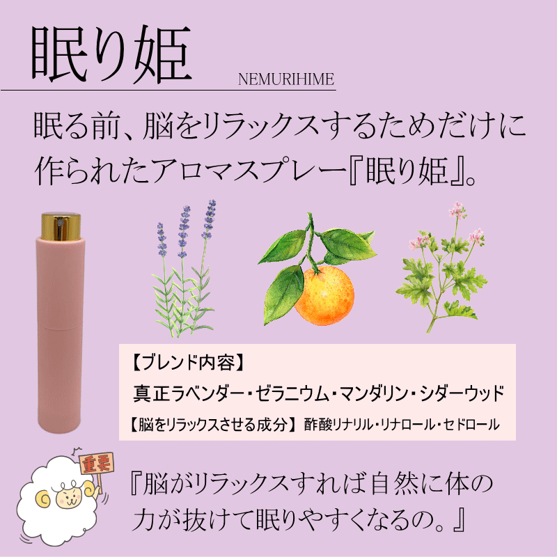 眠り姫 アロマスプレー 睡眠グッズ 健康グッズ 安眠グッズ 快眠グッズ おしゃれ ぐっすり 睡眠 安眠 不眠 アロマ ピローミスト 癒しグッズ リラックス 誕生日 プレゼント 雑貨 寝つき ラベンダー ギフト 枕 いびき防止 プチギフト いい香り 昼寝 睡眠改善