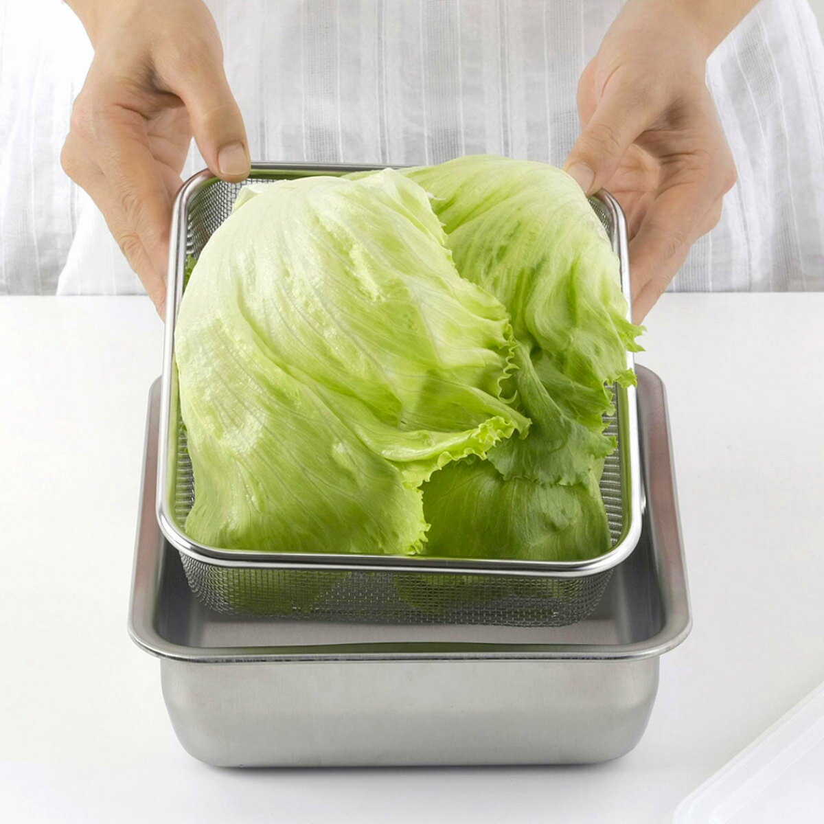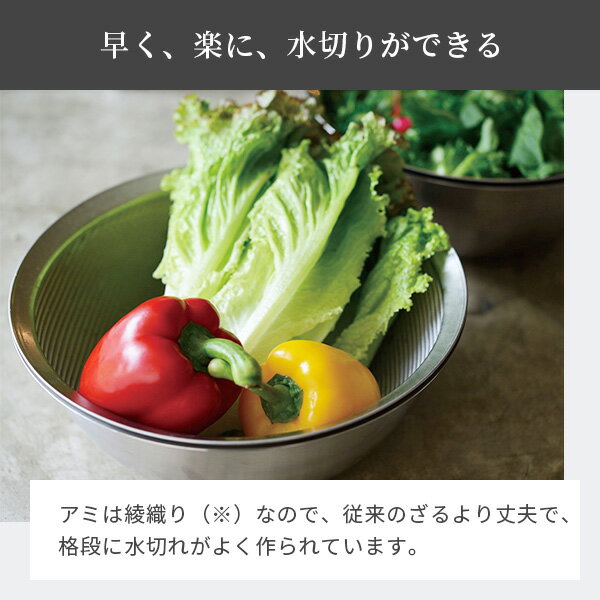使いやすさと美しさにこだわり、職人の手仕事で丁寧に仕上げられた、日本製ならではの上質な調理道具シリーズ。水切りが抜群に早く楽にできる、ステンレス丸ざるです。 米を研ぎ水を切る、野菜の水を切る、麺類の湯を切る等の作業が思いのままにできます。また、粉振るいにもお使いいただけます。 18-8ステンレス鋼が使用してあります。アミは綾織り(※1.)なので、従来のざるより丈夫で、パンチング材のざると比べ、格段に水切れが良くなります。 ※1.綾織りとは、縦線横線が互いに二本ずつ乗り越して上下に交差した織り方です。平織りでは使用する事のできない太い線材を用いる事ができ、強度が優れています。 縁は一枚の板をくり抜いて作られています。斜め内側に傾斜のついた、平縁タイプです。縁のつなぎ目が無いので、汚れがたまらず洗いやすいです。 足つきなので、水切れがよく清潔です。より早くスムーズに水切りしたいときに、ボウルの縁に足を引っ掛けて傾斜をつける、という使い方もできます。 大(27cm)、中(21cm)、小(15cm)の三種類があります。家庭で料理をするうえで過不足ないサイズバリエーションです。深さがあるので、それぞれ十分な容量があります。同サイズのボウルと組み合わせて使用でき、重ねて収納できます。同じサイズのボウルと重ねた時、空間ができて、取り出しやすくなっています。 その他、la base(ラバーゼ)各アイテム一覧はこちら≫ 素材18-8ステンレス鋼 サイズ 小:約15.9×15.9×7.3cm(内寸15cm) 中:約22.4×22.4×9.1cm(内寸21cm) 大:約29.2×29.2×10.2cm(内寸27cm) 重量小:約134g中:約216g大:約382g メーカー型番 小:LB-001中:LB-002大:LB-003 原産国日本 料理研究家の有元葉子先生プロデュースのキッチンウェアブランドです。la base(ラバーゼ)とは、イタリア語で、基本という意味。使いやすさと美しさにこだわり、耐久性、手入れのしやすさも兼ね備えた台所道具がここにあります。職人の手仕事で丁寧に仕上げられた、日本製ならではの上質な調理道具です。