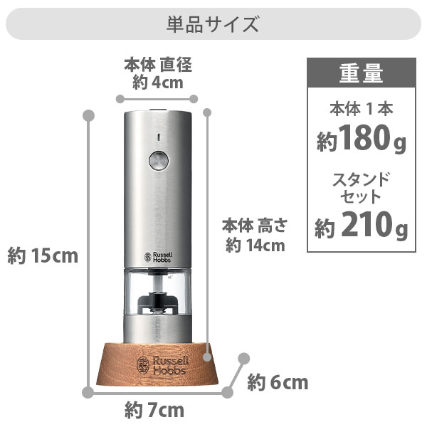 電動ミルシリーズに軽量でコンパクトになった、充電式のテーブルミルが登場。電池が不要なので、長期的にはコストダウンにもなります。スマートなデザインは、テーブルに置くだけで、食卓をスタイリッシュに演出してくれます。 さらに、待望の充電式ミル2本セットも登場しました。卓上での調味用として、塩・胡椒を並べて使える2本用ウッドスタンドが付属されています。キャビンに入る容量が、従来の7933JPよりも約2割アップしました。(※ラッセルホブス社調べ。内容物によって多少の充填量が変わります。) ◆ダイニングテーブルの便利アイテム ハンディサイズでコンパクトなため、スペースをとりません。料理の最後の仕上げにも、食事中の一足しにも便利なアイテムです。シルバーのステンレス質感は、清潔感ある印象を与えてくれ、家庭の食卓がカフェのように、こなれたオシャレ感が演出できます。 ◆片手でワンプッシュ ミル上部のボタンを押すと、電動で挽くことができます。片手で操作できるサイズ感で、食材を混ぜたり炒めたりする手を休めずに使用することができます。 ◆電池を使わない充電式 バッテリーはUSB充電式なので、交換用電池の補充や廃棄のストレスが無く使い続けることができます。 ◆残量が見やすい透明なキャビン キャビンに入る容量が従来の7933JPよりも約2割アップしました。(※1.)キャビン部は透明なので、残量が一目で分かります。また、広めの充填口により、塩や胡椒が充填しやすくなりました。 ※1.ラッセルホブス社調べ。内容物によって多少の充填量が変わります。 ◆汚れを防ぐミルキャップ グラインダー部に残る細かな胡椒や塩がテーブルなどに散って汚れないよう、ミルにはキャップが付いているので、持ち運びや収納に便利です。 ※ウッドスタンド使用時には、ミルキャップを必ず外してセットしてください。 ◆ミルの転倒を防ぐウッドスタンド ウッドスタンドにミルを立てることによって、ミルの転倒を防ぎます。ステンレスとウッドの組み合わせは、一層高級感が増して見え、インテリアに映えます。ミルとウッドスタンドのセット品ならギフトにも最適です。 ※ミルキャップを付けた状態でスタンドにセットしないようお願い致します。取り外しが出来なくなる場合がございます。 ◆岩塩にも使えるセラミック刃 錆の心配がなく、岩塩にも使用できる丈夫なセラミック製の刃です。また、摩擦熱が生じにくいため、熱で飛びやすい胡椒の香りを保ちます。 ◆好みの挽き加減に調整できる キャビン下のダイヤルで、粗いものから細かいものまで、好みに合わせた挽き加減を調節することができます。 【使用できる食材】 ・粒の大きさが2mm〜6mmの食材。 ※食材の大きさ・固さ・形状によっては難しい場合がございます。 ※食材を充填する際は、キャピン全体の8割程度にしてください。 ※スタンドは天然木を使用している為、色や木目に多少のばらつきがあります。何卒ご了承くださいませ。 素材ステンレスセラミックPCTG樹脂ABS樹脂 サイズ単品:約W4.0×D4.0×H14.0cm・スタンドセット時:約W7.0×D6.0×H15.0cm2本セット:約W4.0×D4.0×H14.0cm・スタンドセット時:約W11.5×D6.0×H15.0cm 重量単品:約180g(スタンドセット時:約210g)2本セット:1本約180g(スタンドセット時・2本:約420g) 電源リチウムポリマー電池 3.7V/300mAh フル充電時間約1時間 充電用USBケーブルの長さ約0.7m 付属品充電用USBケーブル(Type-C)キャップスタンドブラシ 使用上の注意※使用するペッパー・塩の粒の大きさの目安は、2mm〜6mmを目安にしてください。 ※食材の大きさ・固さ・形状によっては難しい場合がございます。 ※食材を充填する際は、キャピン全体の8割程度にしてください。 ※ピンクペッパー等の油分を含む食材は、グラインダー部分に食材が詰まってしまう、うまく粉砕されない、といった症状を起こす場合があるため、ご使用はおすすめしておりません。 ※タイム・ローズマリーは、形状が細長いため使用できません。 保証期間1年 メーカー型番シルバー(単品):7941JPブラック(単品):7941JP-BKシルバー(2本セット):7942JPブラック(2本セット):7942JP-BKブラウンゴールド(2本セット):7942JP-BG 原産国中国 1952年イギリスのマンチェスターにて創立。実用性だけでなく、遊び心あるデザインを探求し世界中に家庭用電気製品を届けています。ラッセルホブスのブランド名は創業者であるビル・ラッセルとピーター・ホブスの名前から名付けられました