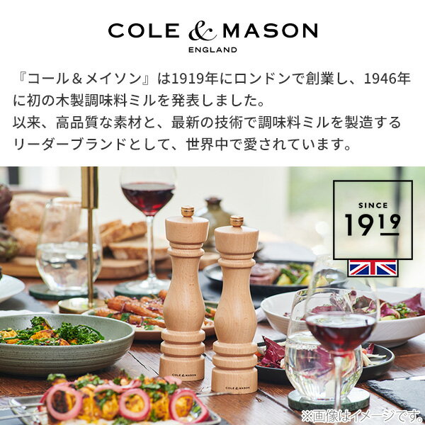 コール&メイソン「ロンドン・コレクション」のシーズニングミルです。耐久性に優れたアクリル製ミルは、伝統的な佇まいながら、モダンでスタイリッシュなデザインを備えています。このため、クラシックなキッチンからコンテンポラリーなキッチンまで、幅広いインテリアに馴染みます。 ミル上部のつまみを回すと細挽きから粗挽きまで簡単に調節可能で、機能性も兼ね備えています。使いやすさと美しいデザインを兼ね備えた、コール&メイソンが誇るミルシリーズです。サイズは13cm、18cm、22cmの3種類で、用途やインテリアに合わせて選べます。 「ソルトミル」には耐塩性に優れたセラミック、「ペッパーミル」には独自技術の「プレシジョンシステム」を採用しており、高品質で均一な挽き心地を実感いただけます。 <「コール&メイソン」で挽く胡椒が美味しい理由(プレシジョンシステム)> 胡椒を挽くのに用いられるペッパーミルは「プレシジョンシステム」を採用。すり潰すのではなく硬化カーボンスチール製の刃で「カット」することで、香りと風味を最大限に引き出す「コール&メイソン」独自の革新的な技術です。また、ソルトミルには錆びにくいダイヤモンドシャープセラミック製の刃を採用しています。 【ロンドン・ビーチウッド】ソルトミル・ペッパーミル 13cm・18cm・22cmはこちら≫ 【ホクストン・ビーチウッド】ソルト&ペッパーミル 10.4cm H233116はこちら≫ 【ホクストン・ギフトセット】ソルト&ペッパーミル シルバー 10.4cm H233116はこちら≫ 【ダーウェント・ギフトセット】ソルト&ペッパーミル H59408GUFはこちら≫ (トレイ・部品)コール&メイソン ミル用 ウッドトレイ・アクリルトレイ はこちら≫ コール&メイソン ステンレス ファンネル H611928CSはこちら≫ 素材 ソルトミル 13cm・18cm・22cm:アクリル・ABS樹脂・セラミック・ステンレス鋼 ペッパーミル 13cm・18cm・22cm:アクリル・ABS樹脂・カーボンスチール・ステンレス鋼 サイズ ソルトミル・ペッパーミル 13cm:約5.6×5.6×13.0cm ソルトミル・ペッパーミル 18cm:約5.8×5.8×18.0cm ソルトミル・ペッパーミル 22cm:約5.8×5.8×22.0cm 重量 ソルトミル 13cm:約220g ペッパーミル 13cm:約225g ソルトミル 18cm:約320g ペッパーミル 18cm:約314g ソルトミル 22cm:約403g ペッパーミル 22cm:約385g メーカー型番 ソルトミル 13cm:H233102UF ペッパーミル 13cm:H233103UF ソルトミル 18cm:H233105UF ペッパーミル 18cm:H233106UF ソルトミル 22cm:H233108UF ペッパーミル 22cm:H233109UF 原産国中国