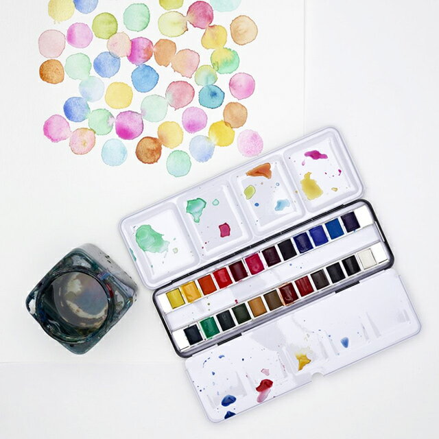 (※旧名称:ハーフパン24色メタルスケッチャーズBoxセット)アマチュアから、大量の絵具を必要とするプロのアーチストまで満足できる、高品質の固形水彩絵具です。チューブから出した色、薄く引き伸ばした時の色、顔料の強度と着色力、そして透明度を考慮に入れて選び抜かれた色彩です。堅牢度が非常に高く、全40色が「専門家用堅牢度」のAAまたはAにランクされています。上位シリーズのW&Nプロフェッショナルウォーターカラーと混ぜることもできます。【セット内容】ハーフパン固形水彩絵具24色、パレット2枚内蔵メタルケース【セット配色内容】レモンイエローヒュー・カドミウムイエローヒュー・カドミウムオレンジヒュー・カドミウムレッドヒュー・アリザリンクリムゾンヒュー・パーマネントローズ・パープルレイク・ジオキサジンパープル・ウルトラマリン・コバルトブルーヒュー・セルリアンブルーヒュー・プルシアンブルー・ビリジアンヒュー・エメラルド・フッカーズグリーンダーク・サップグリーン・イエローオーカー・ローアンバー・バーントシエナ・インディアンレッド・バーントアンバー・ペインズグレー・ランプブラック・チャイニーズホワイト