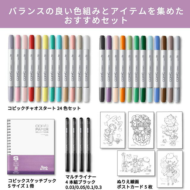 はじめてコピックを使ってイラストを描く方におすすめの商品たちをボックス組みしました。『コピックチャオスタート24色セット』は、スタート12 色セットをベースに色を足し上げる形で、初めての方でも使いやすい色構成となり、お客様に迷いなくお使いいただけます。加えて下描き線画用にコピックユーザーに愛用されております『マルチライナー 4本組 ブラック 』、コピックとの相性抜群のスケッチブック『コピックスケッチブック Sサイズ 』もバンドルしました。さらにオリジナル特典として人気イラストレーター、ちゃだるみさんのぬりえ線画ポストカード×5種類も封入されています。お誕生日やご入学祝などのプレゼント用ギフトに最適です。はじめてコピックを使われる方にも手軽にお楽しみいただけます。【セット内容】コピックチャオ24色:RV21/R000/YR31/E31/W-2/0/R35/E93/Y02/BG23/B02/BV31/E25/YR16/YG11/G17/C-3/V15/YR000/E71/B00/G02/B23/BV25マルチライナー 4本組 ブラック:線幅0.03/0.05/0.1/0.3コピックスケッチブック Sサイズ:用紙入数 30枚入ちゃだるみ オリジナルぬりえ線画ポストカード :5枚入★はじめての方にオススメです!!★
