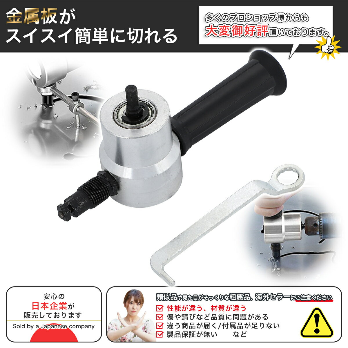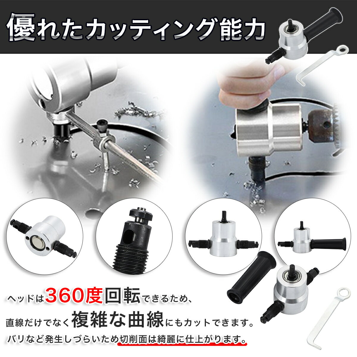 【スイスイ簡単に切れる】 ニブラー 金属板 カッター 金属カッター 切断工具 ドリルアタッチメント メタルカッター ニブラカッター アルミ板カッター 金属切削 工具 【スイスイ簡単に切れる】 【スイスイ簡単に切れる】:金属板が簡単に切れる!電動ドリルまたはエアドリルを接続して使用できる金属板用カッタになります。※注意※類似品や見た目がそっくりな粗悪品、海外セラーにご注意ください(性能が違う、材質が違う、部品が足りない、錆びている、傷や破損など品質に問題がある場合がございます)【優れたカッティング能力】:ヘッドは360度回転できるため、直線だけでなく複雑な曲線にもカットできます。また、バリなど発生しづらいため切削面は綺麗に仕上がります。【切削厚さ】 鉄板:1.8mm、ステンレス鋼板:1.2mm、銅、アルミニウム板:2mm、プラスチック/ファイバーボード:2mmに適しています。ステンレス鋼板、鉄板、アルミニウム、銅板、プラスチック/繊維板などあらゆる種類の薄い金属と板に適用しています。 2