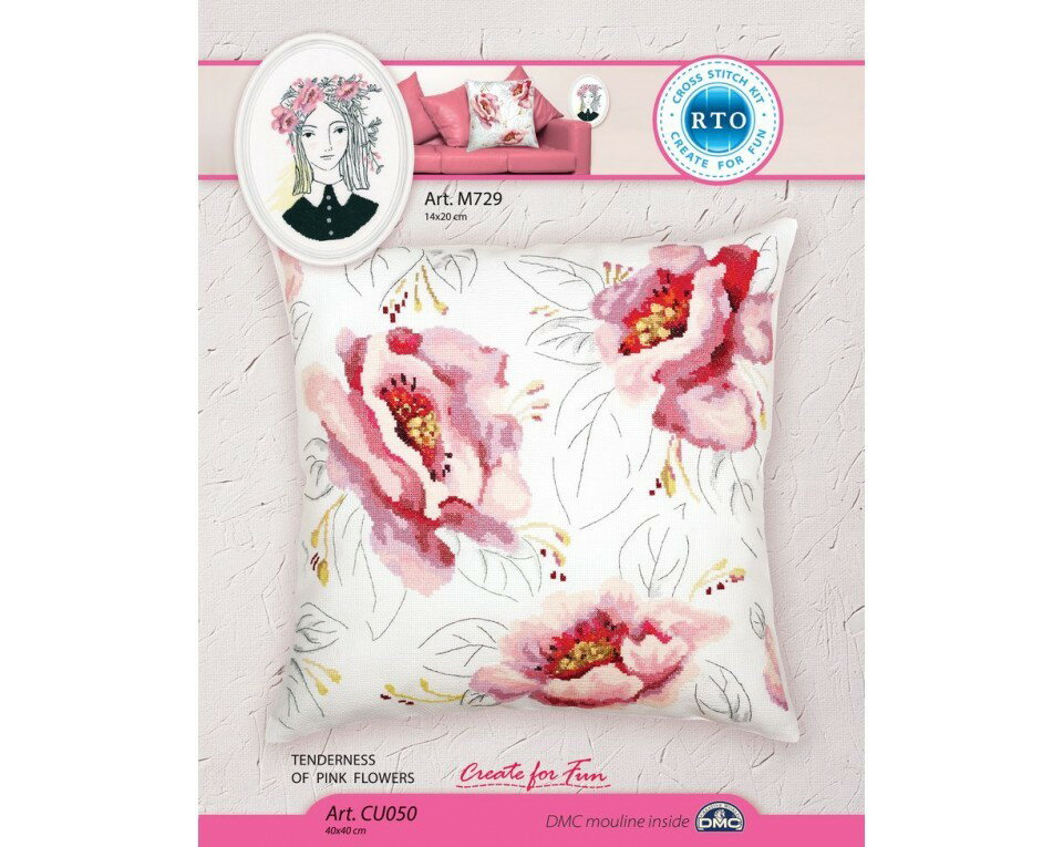 RTO クロスステッチ刺繍キット CU050 「Tenderness of pink flowers」 (ピンクの花のやさしさ) クッション40cm角 【海外取り寄せ/通常納期40〜80日程度】