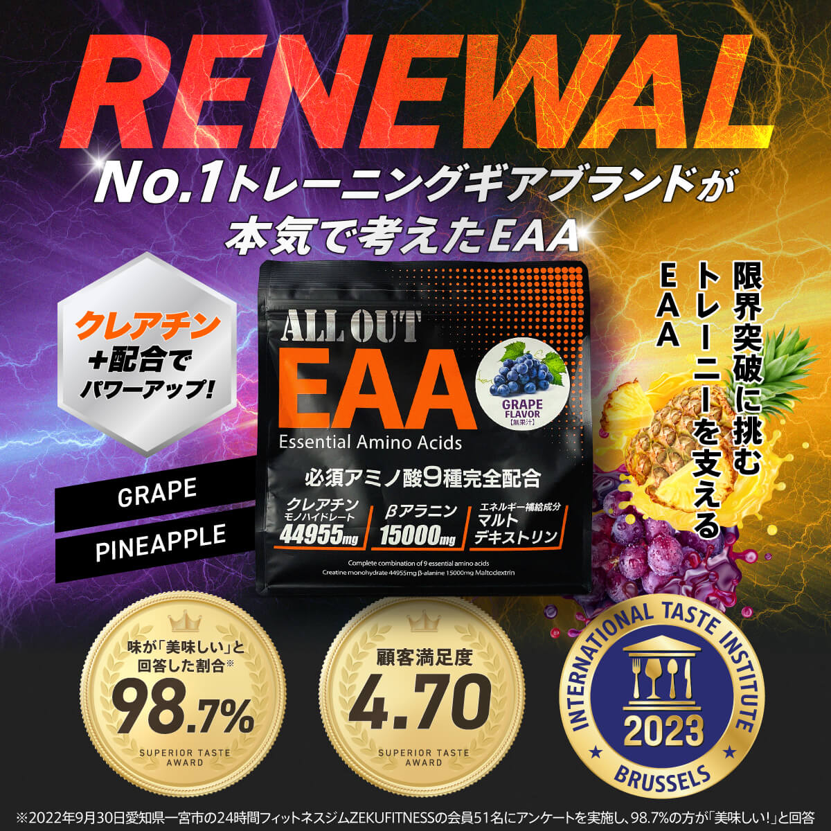 ■【トップ選手が考えたEAAが誕生】国内NO1トレーニングギアブランドのALLOUTからEAAが新登場!リリース記念価格で2022年10月17日販売開始! ■ 【ALLOUT EAAの開発ストーリー】 商品設計の段階から現役のトップフィジーク選手を中心としたプロジェクトチームを発足させて1年3ヶ月の歳月をかけて開発したEAA。 成分、配合、味、どれにも妥協なくハイクオリティなEAAとなっています。 ■ 【限界突破に挑むトレーニーのためのEAA】ALLOUTだから実現したハイクオリティなEAA。限界突破に挑むトレーニーに飲んで頂きたい。そんな思いから生まれたEAAです。 ■ 【業界トップクラス 圧倒的配合量】必須アミノ酸全9種類を完全配合!1回20g当たり:ロイシン2232mg、イソロイシン1116mg、バリン1116mg、メチオニン767mg、ヒスチジン524mg、トリプトファン210mg ■【ALLOUT だから出来た黄金比】9種の必須アミノ酸+B-アラニン(1食当たり2,400mg)。BCAAを1:2:1の黄金比で配合。筋肉の構成成分として欠かせない必須アミノ酸 ・運動時に必要なエネルギー源となるマルトデキストリン ・パフォーマンス向上を目指し、長時間、より負荷をかけて何度もトライし続ける方にお勧めのβアラニン ・これひとつでストイックに鍛える身体が求める栄養素を効率よく一気に素早く補給 (EAA・マルトデキストリン・βアラニンの3つを配合) ■ 【ALLOUT EAAの特徴】ALLOUT EAAはプロスペックとなっておりβアラニンを1回当たり2400mg摂ることがことが可能。 ■【0.01%のこだわり】毎日飲めるおいしさ「美味しくなければ続けれない」ALLOUT EAAは研究に研究を重ねて味にも徹底的にこだわりました。甘味料など0.01%の割合までの精度で配合しています。 ■【98.5%美味しい!と回答】24時間フィットネスジムZEKUFITNESSの会員様51名にアンケートを実施し、98.5%の方が「美味しい!」と回答。 ■【ALLOUT EAAは圧倒的な飲みやすさ】「まずい」「溶けにくい」「臭い」を全て解消! ■【3秒シェイクで驚きの溶け!】 水に溶けにくい微粉を減らし、溶けやすさを追求した独自の製法によりダマにならない品質を実現しました。トップページ > ALL OUT > EAA ■ 配布中のクーポンはこちら