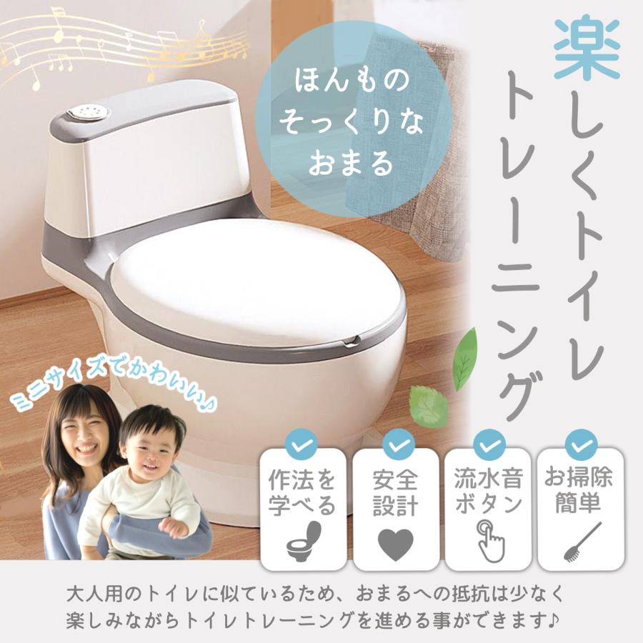 【本物のトイレにそっくり!】 大人用のトイレに似ているため、おまるへの抵抗は少なくトイレを楽しむ事ができます。 また、お子様がパパやママみたいに排泄をする事ができるという喜びも感じられます。 【トイレの作法を学べる】 トイレのフタを開けて排泄をし、流すボタンを押すという流れをトレーニングする事ができます。おまるに座るだけではなく、フタやボタンがあるため、楽しくトイレトレーニングを進める事ができます。 【こどもに考慮した構造】 お子さまの事を第一に考え、使いやすい形状・座りやすい幅や丸み・優しい素材を使用しています。底面には滑り止めがついていて、滑る心配もありません。便座部分は柔らかく優しい素材を使用しているため、座り心地が良くおしりも痛くなりません。 【流水音が流れるボタン】 実際に水は流れませんが、タンクのボタンを押すと流水音が流れるので自分で水を流したような気分になれます。排泄後に流すという感覚を覚えられ、ボタンを押す事が好きなお子さまには嬉しい機能です♪ 〇セット内容 本体、バケツ、袋100枚、ブラシ、ボタン電池(LR44)4個付属