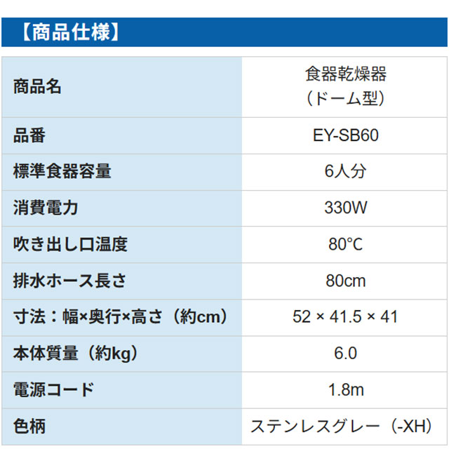 【キーワード】ZOJIRUSHI / 食器乾燥機 /EY-SB60-XH 商品説明カラー ステンレスグレー仕様・特徴 大容量でお手入れカンタン。大きくふたが開くドーム型。食器乾燥器6人用消費電力:330Wワイドオープンふたまな板乾燥可能Ag+抗菌加工 80cmロング排水ホース電源コードの長さ:1.8mAg+抗菌(排水ホース、水受け)クリアコートステンレスボディステンレス:トレー、かご、はし立て最大まな板サイズ:幅250×長さ420×厚さ30mmサイズ 外形寸法 幅×奥行×高さ(約cm):52×41.5×41重量 質量(約kg):6付属品排水ホース(80cm)1本発売日 2016年