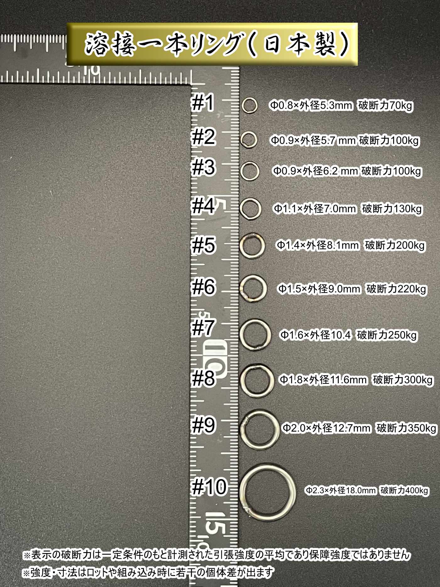 御覧いただきありがとうございます。 有限会社東海製ステンレス製溶接1本リングになります。 国産に拘りひとつひとつ手作業で組んでからアーク溶接でステンレスを溶かしこんでいます。 丸線の溶接なので、ショックリーダーに傷が付きにくい仕様のリングとなっております。 プロの漁業関係者の方たちからも度重なるリピートを頂いております。是非お試しください。 プロの漁業関係者の方たちからも度重なるリピートを頂いております。是非お試しください。 #1 線径Φ0.8×外径5.3mm 破断強度70kg #2 線径Φ0.9×外径5.7mm 破断強度100kg #3 線径Φ0.9×外径6.2mm 破断強度100kg #4 線径Φ1.1×外径7.0mm 破断強度130kg #5 線径Φ1.4×外径8.1mm 破断強度200kg #6 線径Φ1.5×外径9.0mm 破断強度220kg #7 線径Φ1.6×外径10.4mm 破断強度250kg #8 線径Φ1.8×外径11.6mm 破断強度300kg #9 線径Φ2.0×外径12.7mm 破断強度350kg以上 #10 線径Φ2.3×外径18.0mm 破断強度400kg以上 表示の破断強度は一定条件のもと計測された引張強度の平均であり保障強度ではありません。 保障強度ではありませんが、日々企業努力を重ね組み込み精度を上げることにより海外製品や他社製品を圧倒する引張強度を誇っています。 ロットごとに試験を行っておりますので表示よりも高い強度が出る場合もございますが、環境・条件・個体差などにより数値は変わってくるのであくまで平均値を表記しております。 サイズやパーツの組み合わせ等でご希望がありましたら質問欄からお気軽にお問合せください。 製作が可能なものでしたら出品させていただきます。 【商品詳細】 ・ブランド名:東海 ・メーカー型番:SR ・個数:20個、40個からお選びください ・ご注意:モニターの発色具合により実際の商品とは色合いが異なる場合がございます。