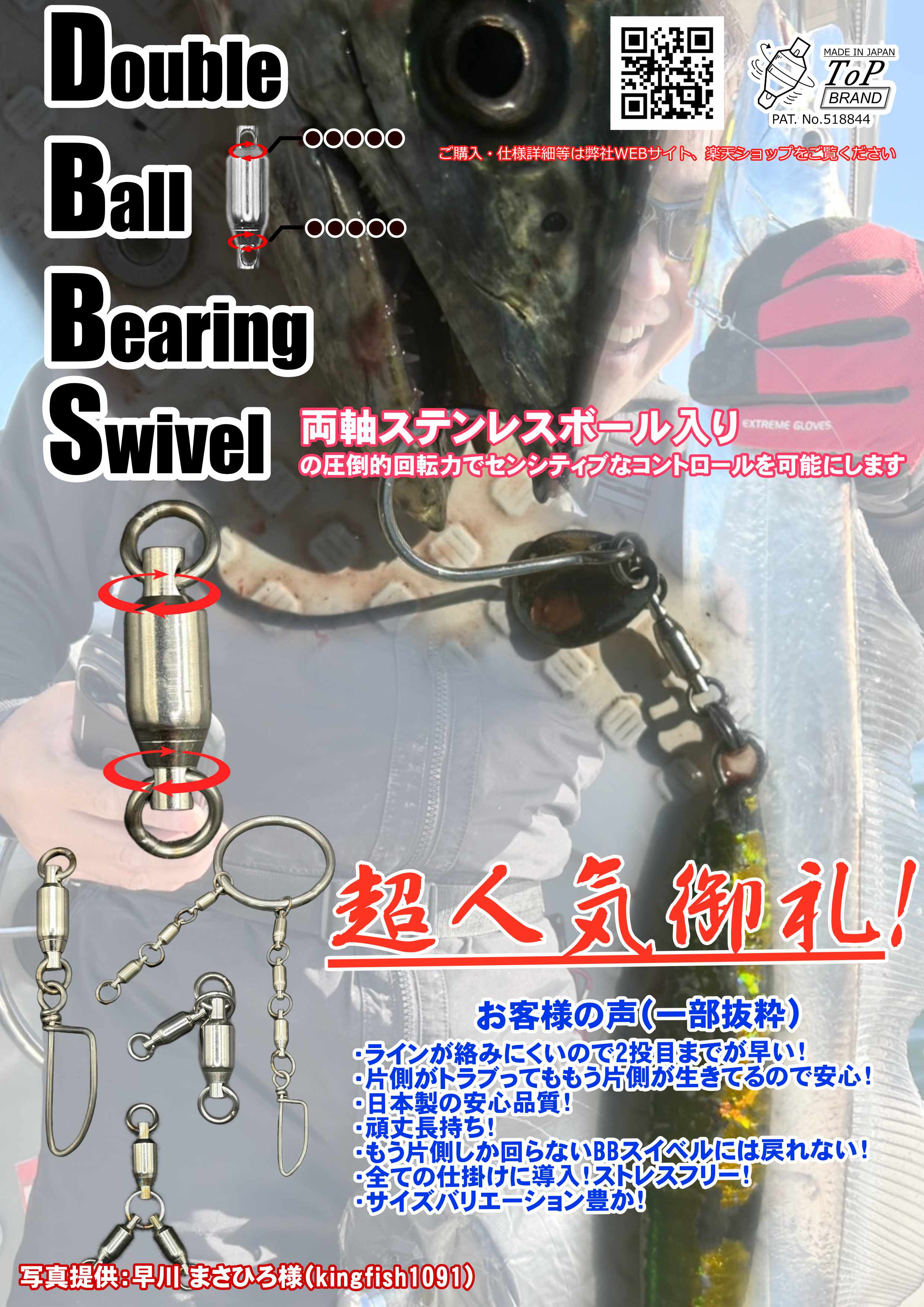 ご覧いただきありがとうございます。 こちらはお客様のオーダーから生まれ、ラインナップの許可を頂いたライト中深場向け深海リングになります。 6×50mmのステンレスヨリトリリングの上下に#5のダブルボールベアリングスイベルをそれぞれ3個、計6個使用した贅沢な仕様でお客様からもご好評いただいております。 ヨリトリリングのストックが常時少量のため在庫数が常に少なくなっておりますので納期が気になる方はお気軽にお問合せください。 また、近しい仕様でサイズ違い、スナップ違いなども製作可能ですのでかゆいところに手が届かないような場合もぜひ一度お問合せください! 即日発送を心がけておりますが土日祝はお休みをいただいております。 平日のご注文をおすすめしております。ご覧いただきありがとうございます。 こちらはお客様のオーダーから生まれ、ラインナップの許可を頂いたライト中深場向け深海リングになります。 6×50mmのステンレスヨリトリリングの上下に#5のダブルボールベアリングスイベルをそれぞれ3個、計6個使用した贅沢な仕様でお客様からもご好評いただいております。 ヨリトリリングのストックが常時少量のため在庫数が常に少なくなっておりますので納期が気になる方はお気軽にお問合せください。 また、近しい仕様でサイズ違い、スナップ違いなども製作可能ですのでかゆいところに手が届かないような場合もぜひ一度お問合せください! 即日発送を心がけておりますが土日祝はお休みをいただいております。 平日のご注文をおすすめしております。