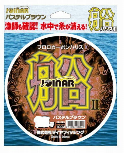 【東洋ナイロン パステルブラウン 船ハリス 2.5号 100m 商品の説明】 船釣り専用フロロカーボンハリス ●船釣り専用にカスタマイズしたジョイナー船ハリスIIは、フロロカーボン素材。シャキッとした感触。8〜10ヒロにもおよぶ長ハリスでも高感度、高強度を約束します。しかも操作性といった扱いやすさを加味してトラブルを回避し、手返しよく効果的な釣りを実現させます。カラーはプロの漁師も推薦するパステルブラウン。海水の屈折率との差、僅か0.09を実現し、海水中において完全にカモフラージュされるその様は驚異の一言。【糸が消える】という表現がピッタリなハリスです。【パステルブラウン 船ハリス 2.5号 100m について】 船釣り専用フロロカーボンハリス ●船釣り専用にカスタマイズしたジョイナー船ハリスIIは、フロロカーボン素材。シャキッとした感触。8〜10ヒロにもおよぶ長ハリスでも高感度、高強度を約束します。しかも操作性といった扱いやすさを加味してトラブルを回避し、手返しよく効果的な釣りを実現させます。カラーはプロの漁師も推薦するパステルブラウン。海水の屈折率との差、