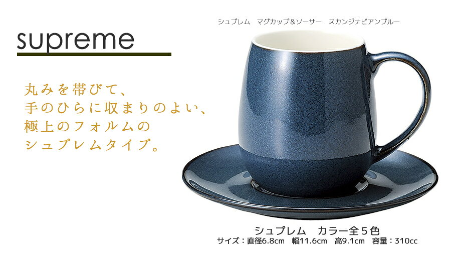 -香りを楽しむためにつくられた、 究極のコーヒーカップ- シュプレム&フィーヌ こだわり抜かれたフォルムは、 コーヒーの香りをカップの中に包み込むように 設計された形状です。 いつもと同じコーヒーをより美味しく味わうとともに、 カップの内側に満ちた、リッチで濃厚なアロマを 楽しむことができます。 ★2フォルム・5カラーからお選びください★ 品名 シュプレム サイズ カップ:幅11.6cm 直径6.8cm 高9.1cm 兼用ソーサー:直径15.9cm 高:1.6cm 重量 カップ:約260g ソーサー:約185g 容量 310cc 材質 磁器 質感 つやあり・つるつる 電子レンジ OK 食器洗浄機 OK オーブン OK 直火 NG 生産地 日本・美濃焼 注意点 全てA級品での販売となりますが、部分的に釉薬の濃淡がある場合がございます。予めご了承ください。カップとソーサーの色味が多少異なる場合がございます。 品名 フィーヌ サイズ カップ:幅11.9cm 直径7.1cm 高8.3cm 兼用ソーサー:直径15.9cm 高:1.6cm 重量 カップ:約250g ソーサー:約185g 容量 320cc 材質 磁器 質感 つやあり・つるつる (コーパルのみ艶なし) 電子レンジ OK 食器洗浄機 OK オーブン OK 直火 NG 生産地 日本・美濃焼 注意点 全てA級品での販売となりますが、部分的に釉薬の濃淡がある場合がございます。予めご了承ください。カップとソーサーの色味が多少異なる場合がございます。 ▼フォルムタイプ1:シュプレム▼ 下記の5カラーよりお選びください ※コーパルのみ、釉薬の種類が異なり、マットな質感で他の色よりも光沢がありません。ご注意ください。 ▼フォルムタイプ2:フィーヌ▼ 下記の5カラーよりお選びください コーパルのみ、釉薬の種類が異なり、マットな質感で他の色よりも光沢がありません。ご注意ください。