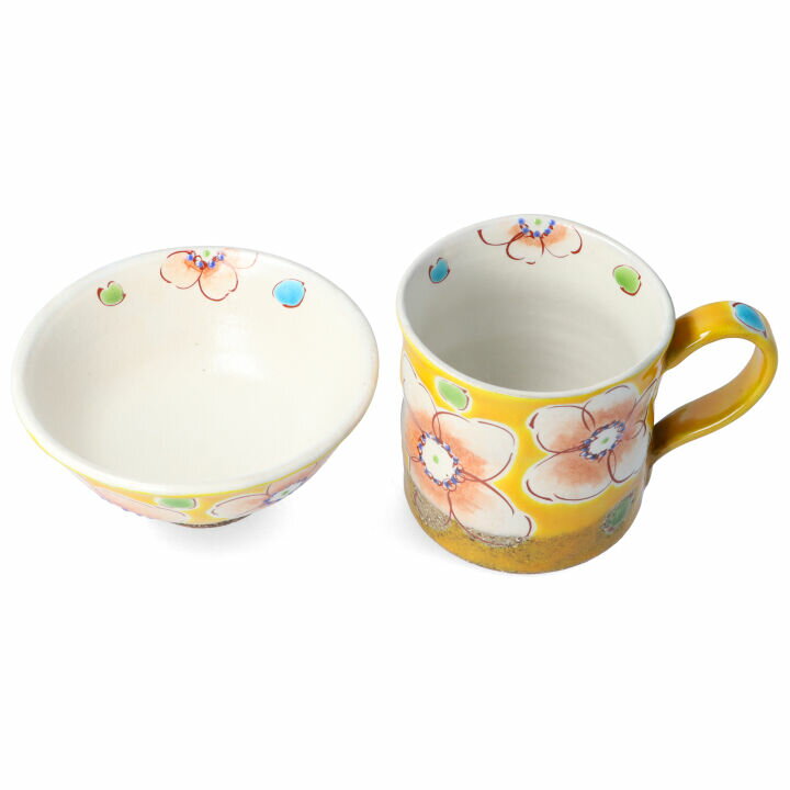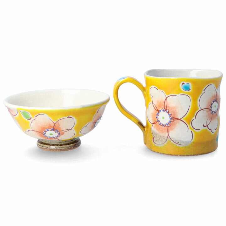 九谷焼 飯碗・マグカップセット イエロー花うらら / 虚空蔵窯<ご飯茶碗 マグカップ セット 人気 ギフト 贈り物 長寿祝い/内祝い/退職祝い/お祝い/> 化粧箱入り