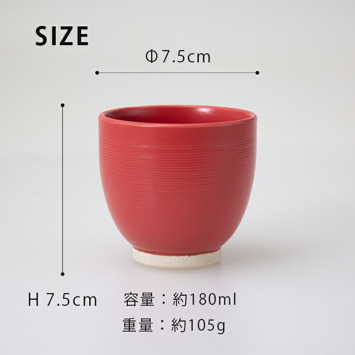 商品詳細 サイズ(cm) φ7.5×7.5 容量(ml)※満水の状態 180 重量(g) 約105 素材 陶器 生産地 波佐見 使用 レンジ使用×/オーブン×/食器洗浄機使用× 備考 ※重さは一つ一つ個体差があるため、目安としてご参考にご覧ください。※一つ一つ手作業で行っているため、色ムラ・形が微妙に異なる場合がございます。 ※ご覧のモニターによって、若干色が異なる場合がございます。※段ボール箱入りです。— 赤千段 湯呑 Φ7.5×高さ7.5cm 105g 180ml — 陶器の温かみを感じられる湯呑。小ぶりなのみきりサイズです。お揃いの急須と合わせてお使いいただけます。セットで贈り物にもおすすめです。
