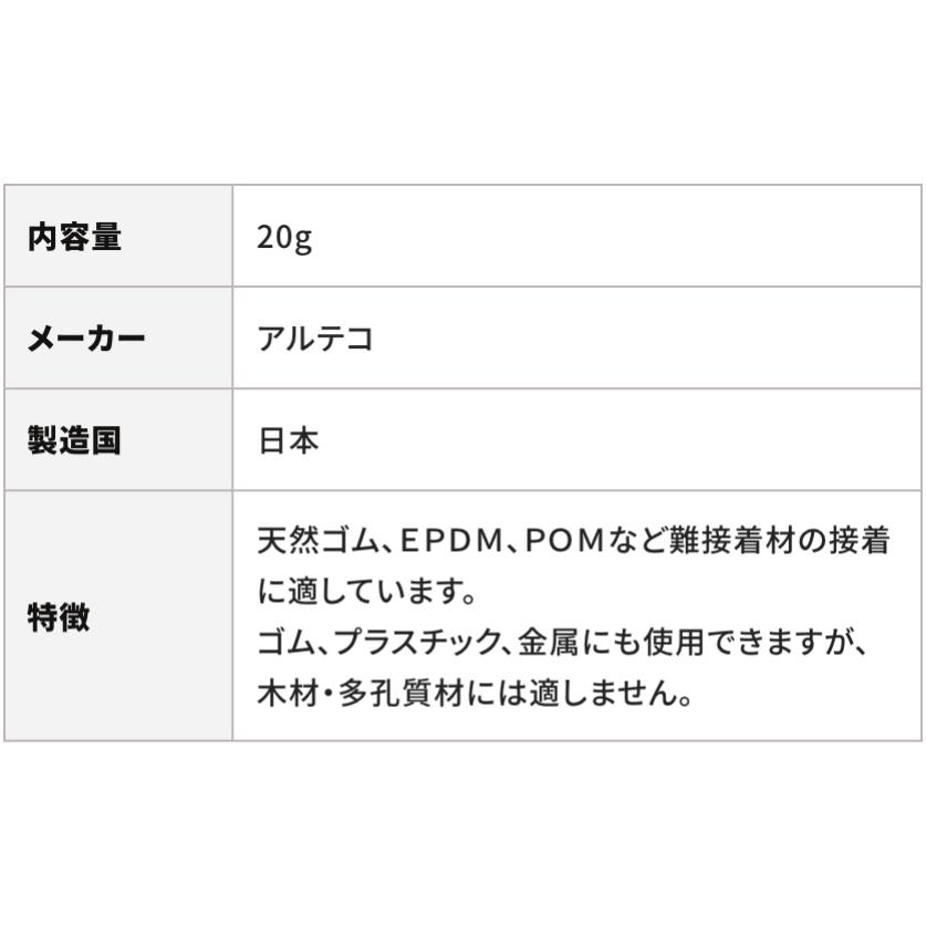 内容量20g × 1本メーカーアルテコ製造国日本特徴天然ゴム、EPDM、POMなど難接着材の接着に適しています。 ゴム、プラスチック、金属にも使用できますが、木材・多孔質材には適しません。注意事項佐川急便での配送がご希望の場合は送料を再計算いたしますので、ご注文後に届くサンクスメールの合計金額をご確認ください。