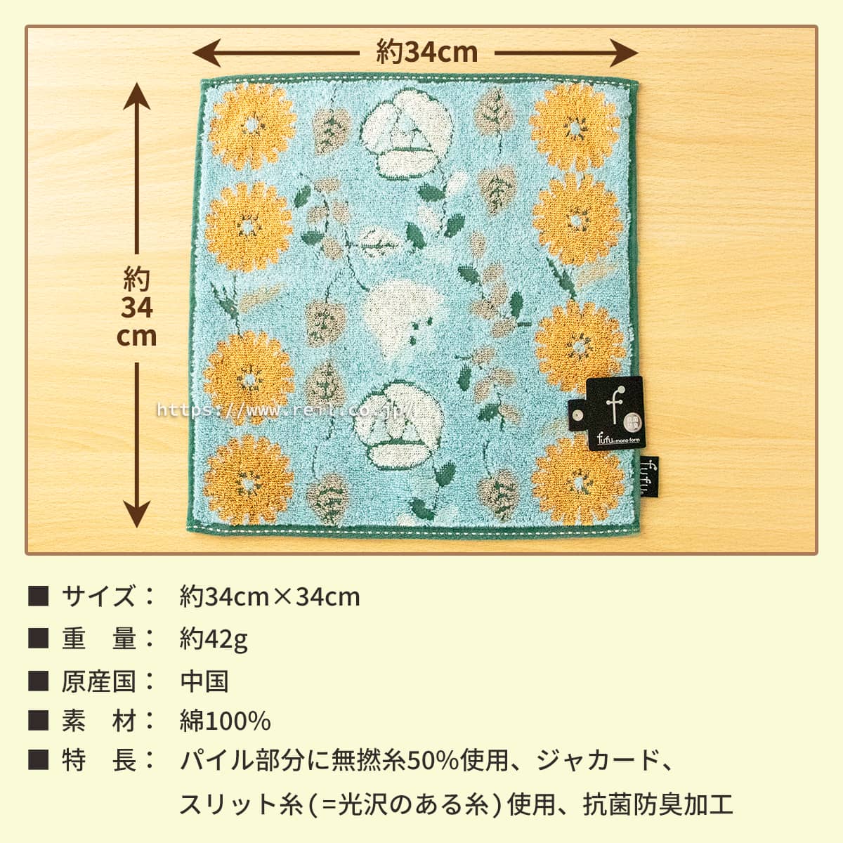 サイズ 約34×34cm 重量 約42g 色 ブルー、グレー、ピンク 特徴 ・綿100% ・抗菌防臭加工 ・中国製 ・無撚糸使用(パイル部分に50%) ・スリット糸(光沢のある糸)使用 ・ジャカード ~550円 551円~1100円 1101円~2200円 2201円~3300円ギフトボックス包装について ギフトボックス包装をご希望のかたはこちらから箱と包装紙をお選びください。※有料サービスとなります。 (簡易ラッピングは無料です。ご注文画面で包装紙の種類をお選びください。) お花の咲き誇る庭園をタオルにしたような『フルフル』。 新生活の方を始め、ご家族で色を楽しんだり、 みんなで思う存分使って頂きたい「抗菌防臭加工」のタオルです。 ほかのサイズはこちら >>【フルフル】の一覧はこちら 落ち着いたやさしいトーンの3色展開。裏側までカラフルで、一枚で二度お楽しみいただけるデザインです。 必ずご確認下さい ◆こちらの商品は下記の枚数までゆうパケット(350円)での発送が可能です。  ・ウォッシュタオル:4枚まで それを超える枚数の場合、または他商品との同梱の場合は佐川急便(通常送料)での発送になります。 ◆【ゆうパケット発送の場合の注意点】  ※ラッピング・日時指定・代引きはご利用いただけません。  ※梱包時に真空圧縮をいたします。(そのままで箱に入る場合はしません)  上記ご了承いただけない場合は「佐川急便」をお選びください。 ◆注文個数によりお届け日が変わることがあります。 何卒、ご了承くださいませ。 ◇サイズ/約34×34cm ◇重量/約42g ◇色/ブルー、グレー、ピンク ◇特長/抗菌防臭加工、綿100%、パイル部分に約50%無撚糸使用、スリット糸(光沢のある糸)使用、ジャカード、中国製 おすすめウォッシュタオル アテナ アクアボール モーメント エナガ ⇒ウォッシュタオルの一覧はこちら ⇒花柄『フルフル』の一覧はこちら ⇒fufu(フフ)の一覧はこちら ⇒抗菌防臭タオルの一覧はこちら ⇒トップページはこちら