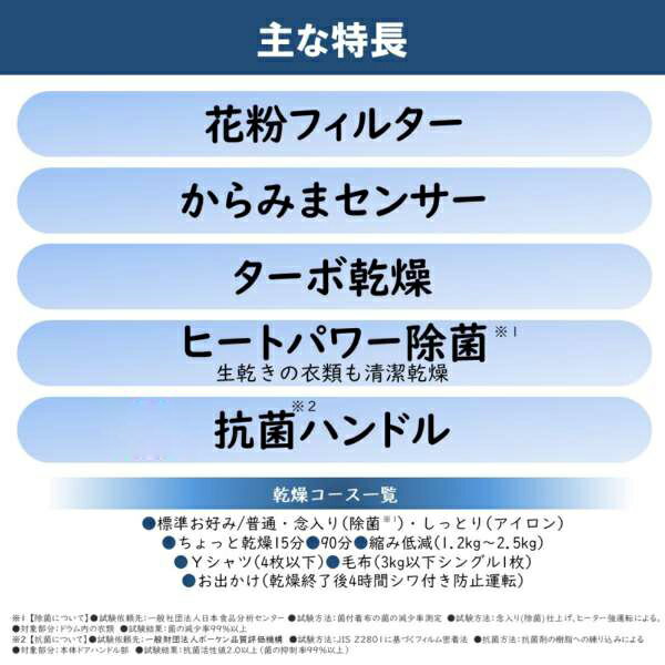 ※製品の詳細についてはメーカーサイトにて改めてご確認ください 東芝 TOSHIBA 衣類乾燥機 4.5kg ED-45A4(W) 花粉フィルター搭載で、ふんわり清潔仕上げ。 【数量限定】 ●ヒーター切換(ターボ/強/弱) ●コース切換(15分/90分/縮み低減/おでかけ/Yシャツ/毛布) ・15分コース 衣類の乾き具合に関係なく、15分だけ運転します。 ・Yシャツコース(4枚以下) 形態安定のYシャツのシワを少なく乾燥します。 ・縮み低減コース 温風の熱の影響をうけにくくした、熱に弱い衣類の専用コースです。乾きすぎによる布縮みを防止するため標準コースに比べ、乾き具合を低く設定しています。 ・90分コース 衣類の乾き具合に関係なく、90分だけ運転します。 ・お出かけコース 乾燥運転中の音を小さくします。お出かけの時などすぐに衣類を取り出せないときのため、乾燥終了後のシワ付きを少なくするソフトキープ運転が長く設定してあります。 ・毛布コース 毛布や羽毛肌掛け布団を乾燥させます。 ●標準お好み仕上げ(標準/念入り/普通/アイロン) 衣類の種類や、お好みにより乾燥具合を調整できます。 ●花粉フィルターでスッキリ! 小さな粒子もとらえる花粉フィルターを標準搭載しているのは東芝だけ。繊維の奥に入った花粉もスッキリ取り去って清潔にします!衣類についた花粉を90%以上除去できます。 ●からみをほぐして、ふんわり乾燥! からみまセンサーが衣類のからみを検知し、東芝独自の反転機能でほぐして乾燥します! 1.からみまセンサーが衣類のからみを検知 2.ドラムを反転させ、からみをほぐす 3.ほぐれると通常運転に ●ターボ乾燥 ヒーターのパワーと風量アップで乾燥時間を短縮! ●ソフトキープ機能 乾燥が終了してから所定の時間が経過するまでの間、衣類のシワ付きを少なくするために5分毎に10秒間送風運転を行います。ドアを開けると自動的に電源が切れ、終了します。 ●フィルターお掃除ランプ フィルターが目詰まりすると点滅し、ブザーが鳴ります。 ●抗菌ハンドル 1番よく触れるハンドル部分が抗菌加工で清潔に。 標準乾燥容量:4.5kg 本体サイズ:650×468×650mm(幅×奥行×高さ) 製品質量:22kg 付属品:排水ホース、ホースバンド 【配送について】 沖縄ならびに離島配送不可、北海道など沖縄ならびに離島配送不可、北海道など一部地域におかれましては、別途、追加送料等が必要な場合がございます。