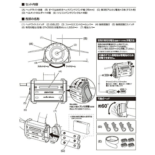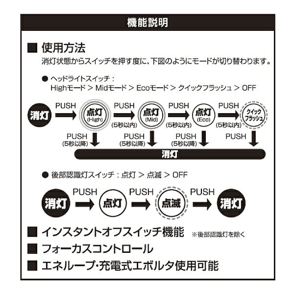 【訳あり・アウトレット・外箱傷み品】 ※商品自体は新品未使用品ですが、店頭在庫のため外箱に汚れやスレ、キズなどがあります。 ※製品の詳細についてはメーカーサイトにて改めてご確認ください ※付属のテスト用電池は乾電池です。充電池ではありません ジェントス GENTOS LEDヘッドライト HEAD WARSシリーズ 耐塵・防滴 HW-G433HD 【数量限定】 ●HW-X433HD KDHL-2110 の後継モデルで HW-K433HD の前モデルとなります。 ●ヘルメットホルダーやシリコンバンドなどの付属アクセサリーが充実 ●乾電池/専用充電池兼用、後部認識灯搭載で後方の安全性を確保 ●フォーカスコントロール レバーを操作することでスポットビームからワイドビームまで無段階に調節可能。 ●インスタントオフスイッチ 点灯後、一定時間経過後にスイッチを押すと、どのモードからでも一回の操作で消灯できます。 ●後部認識灯 点灯・点滅により後方からの視認性を確保。 ●60°可動式ヘッド ●チャージングインジケーター 充電中の充電状態をお知らせ。 ●ヘッドプッシュスイッチ(ヘッド部) ●サイドスイッチ(電池ボックス部) ●エネループ・充電式エボルタ使用可能 使用光源:高輝度チップタイプ白色×1個 明るさ(約):520ルーメン(Highモード時)/ 230ルーメン(Midモード時)/ 50ルーメン(Ecoモード時) 光度(約):5408カンデラ(Highモード時)/ 2682カンデラ(Midモード時)/ 571カンデラ(Ecoモード時) 使用電池:単3形アルカリ電池×3本 または 専用リチウムポリマー充電池 3.7V 1,800mAh 点灯時間(約):【ヘッド部】8時間(Highモード)/ 14時間(Midモード)/ 48時間(Ecoモード)/ 130時間(クイックフラッシュ)、【後部認識灯】340時間(点灯)/ 710時間(点滅) 照射特性:フォーカスコントロール 照射距離(約):147m(最大時) 保護等級:耐塵・防滴仕様(IP64準拠) 落下耐久:1m落下耐久 本体サイズ(約):【ヘッド部】W73.1×H52.8×D38.8mm、【電池ボックス部】W84.8×H53.8×D30.4mm 本体質量(約):223g(電池含む) 付属品:すべり止め付きヘッドバンド、シリコンバンド(バックル4個)、ヘルメットホルダー4個、テスト用電池 【配送について】 沖縄ならびに離島配送不可、北海道など一部地域におかれましては、別途、追加送料等が必要な場合がございます。
