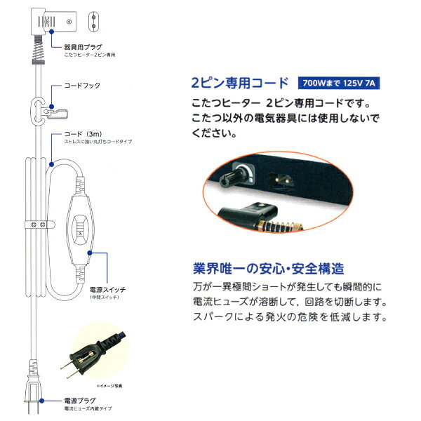 ※現在、お使いのこたつコードまたはヒーターユニットの型番からお取替え可能なこたつコードをご確認ください ※製品の詳細についてはメーカーサイトにて改めてご確認ください ※特殊なプラグ形状にはご使用いただけない場合があります ※こたつ以外の電気器具には使用しないでください ※交流100Vで15A以上単独でご使用ください METRO メトロ電気工業 こたつコード3m こたつヒーター 2ピン専用 中間スイッチ付 BC-2PL(A) 【数量限定】 ●破損や劣化時の交換品として ●電源スイッチ付 ベーシックで使いやすいロングセラー商品。 ●業界唯一の安心構造 電源プラグに電流ヒューズを内蔵。万が一、異極間でショートが発生しても瞬時に電流ヒューズが溶断し回路を切断するので、スパークによる発火の危険を低減します。 ●安心安全 2つの特徴 ・電源プラグに電流ヒューズを内蔵 ・ストレスに強い丸打ちコードタイプ ●2ピン専用コード(700Wまで 125V 7A) こたつヒーター 2ピン専用コードです。こたつ以外の電気器具には使用しないでください。 定格:AC125V 7A 電源コード:丸打ちコード 安全装置:電流ヒューズ コードの長さ:3m 【送料について】 沖縄ならびに離島配送不可、北海道など一部地域におかれましては、別途、追加送料等が必要な場合がございます。