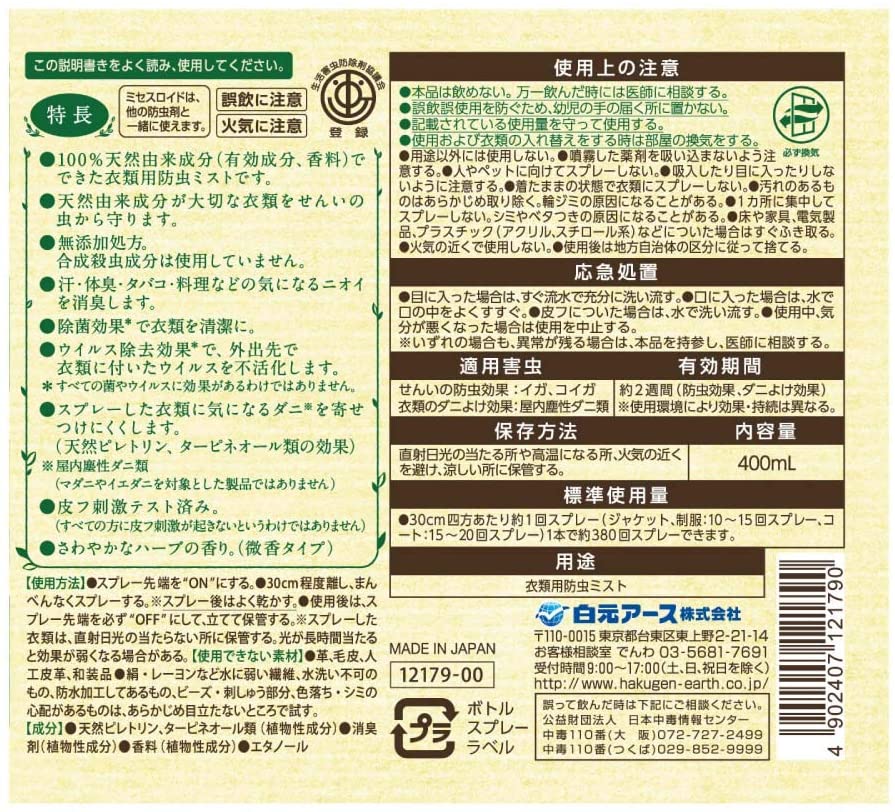 この商品の特徴 100%天然由来成分※でできた衣類用防虫ミスト。無添加処方(合成殺虫成分は使用していません)。防虫・消臭・除菌・ウイルス除去・ダニよけ効果で大切な衣類を守ります。防虫、ダニよけ効果は約2週間持続。※有効成分、香料 商品の特長 衣類ケアミスト機能 ●100%天然由来成分(有効成分、香料)でできた衣類用防虫ミストです。 ●天然由来成分が大切な衣類をせんいの虫から守ります。 ●無添加処方。合成殺虫成分は使用していません。 ●汗・体臭・タバコ・料理などの気になるニオイを消臭します。 ●除菌効果*で衣類を清潔に。 ●ウイルス除去効果*で、外出先で衣類に付いたウイルスを不活化します。 *すべての菌やウイルスに効果があるわけではありません。 ●スプレーした衣類に気になるダニ※を寄せつけにくくします。 (天然ピレトリン、ターピネオール類の効果) ※屋内塵性ダニ類(マダニやイエダニを対象とした製品ではありません) ●皮フ刺激テスト済み。 (すべての方に皮フ刺激が起きないというわけではありません) ●さわやかなハーブの香り。(微香タイプ) 【用途】 衣類用防虫ミスト 成分 ●天然ピレトリン、ターピネオール類(植物性成分) ●消臭剤(植物性成分) ●香料(植物性成分) ●エタノール 商品の使い方 【使用方法】 ●スプレー先端を“ON”にする。 ●30cm程度離し、まんべんなくスプレーする。※スプレー後はよく乾かす。 ●使用後は、スプレー先端を必ず“OFF”にして、立てて保管する。 ※スプレーした衣類は、直射日光の当たらない所に保管する。光が長時間当たると効果が弱くなる場合がある。 【使用できない素材】 ●革、毛皮、人工皮革、和装品 ●絹・レーヨンなど水に弱い繊維、水洗い不可のもの、防水加工してあるもの、 ビーズ・刺しゅう部分、色落ち・シミの心配があるものは、あらかじめ目立たないところで試す。 【適用害虫】 せんいの防虫効果:イガ、コイガ 衣類のダニよけ効果:屋内塵性ダニ類 【使用上の注意】 ●本品は飲めない。万一飲んだ時には医師に相談する。 ●誤飲誤使用を防ぐため、幼児の手のとどく所に置かない。 ●記載されている使用量を守って使用する。 ●使用および衣類の入れ替えをする時は部屋の換気をする。 ●用途以外には使用しない。 ●噴霧した薬剤を吸い込まないよう注意する。 ●人やペットに向けてスプレーしない。 ●吸入したり目に入ったりしないように注意する。 ●着たままの状態で衣類にスプレーしない。 ●汚れのあるものはあらかじめ取り除く。輪ジミの原因になることがある。 ●1カ所に集中してスプレーしない。シミやベタつきの原因になることがある。 ●床や家具、電気製品、プラスチック(アクリル、スチロール系)などについた場合はすぐふき取る。 ●火気の近くで使用しない。 ●使用後は地方自治体の区分に従って捨てる。 【応急処置】 ●目に入った場合は、すぐ流水で充分に洗い流す。 ●口に入った場合は、水で口の中をよくすすぐ。 ●皮フについた場合は、水で洗い流す。 ●使用中、気分が悪くなった場合は使用を中止する。 ※いずれの場合も、異常が残る場合は、本品を持参し、医師に相談する。 【有効期間】 約2週間(防虫効果、ダニよけ効果) ※使用環境により効果・持続は異なる。 【保存方法】 直射日光の当たる所や高温になる所、火気の近くを避け、涼しい所に保管する。 【標準使用量】 ●30cm四方あたり約1回スプレー ジャケット、制服:10〜15回スプレー コート:15〜20回スプレー 1本で約380回スプレーできます。 広告文責: 株式会社渋谷商店 022-796-6964(連絡先電話番号) メーカー(製造): 白元 区分: 防虫剤 ミセスロイド