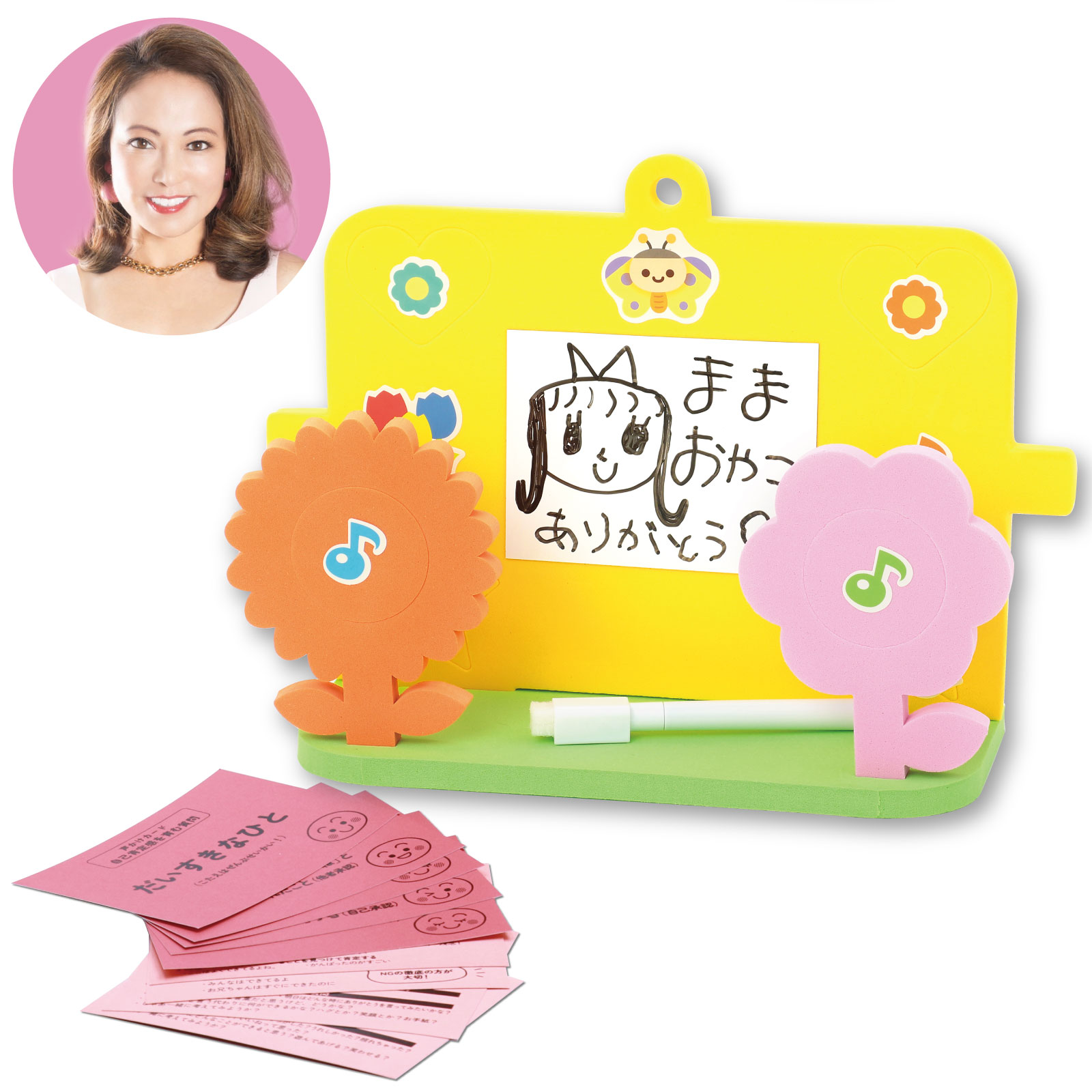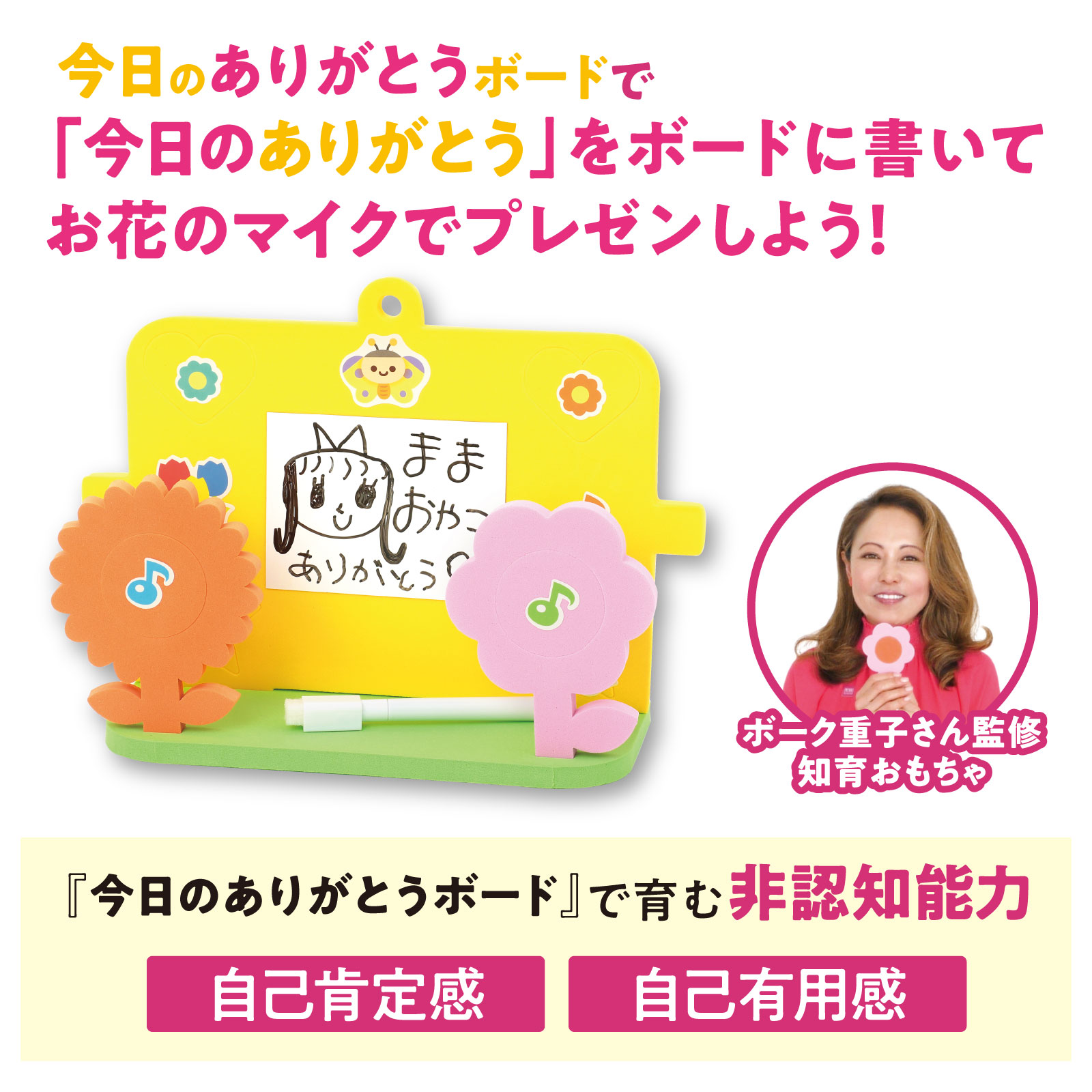 商品情報商品説明ボーク重子先生の非認知能力を育むおもちゃシリーズ!皆さんは、今日何回「ありがとう」と言いましたか??このボードは、子どから保護者へ、保護者からこどもへの「ありがとう」を伝えるツールです。「今日のありがとう」を書いたら、お花のマイクを持ってLet's talk about it! オリジナルの「声かけカード」が付属されており、こどもにどんな超えかけをすると効果的かが効果的にわかります。包装形態ヘッダー付袋入材質EVA、紙、マグネットセット内容ありがとうボード×1・マグネットシート×2・ボードマーカー×1・飾り付けシール×1・声掛けカード×9・取説×1ボーク重子先生 監修 非認知能力 教育 学習 育児 子育て 自己肯定感 自己効力感 自己有用感 想像力 共感力 自制心 主体性 育む どもの学び 大人の学び 子育て力アップ 動画付 悩み解決テキストブック付 今日のありがとうボード 5